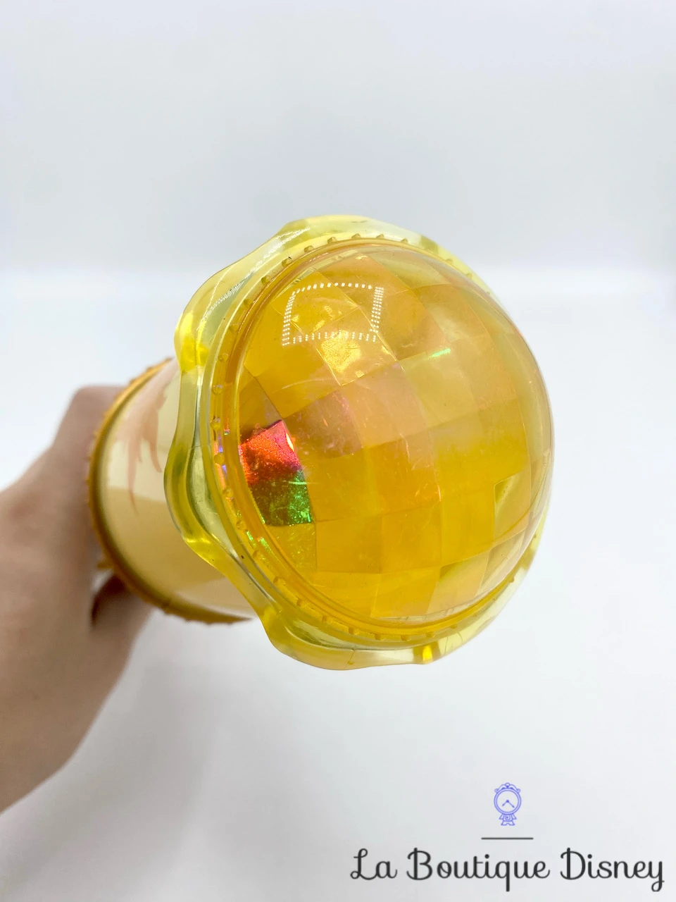 Baguette en plastique dorée sur le thème de Raiponce. La baguette possède à son extrémité la célèbre lanterne avec le soleil, symbole du Royaume de Corona. Sur le manche, il y a des petits strass avec un autocollant sur lequel on peut y voir la princesse Raiponce, Flynn Rider ou encore l’inscription « Disney On Ice ». Bouton sur le manche doré permettant à la baguette de s’éclairer en différentes couleurs.