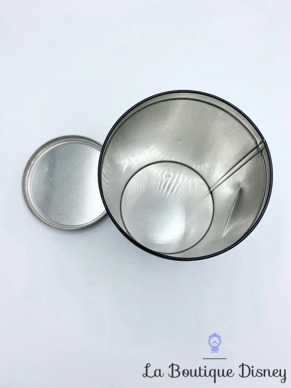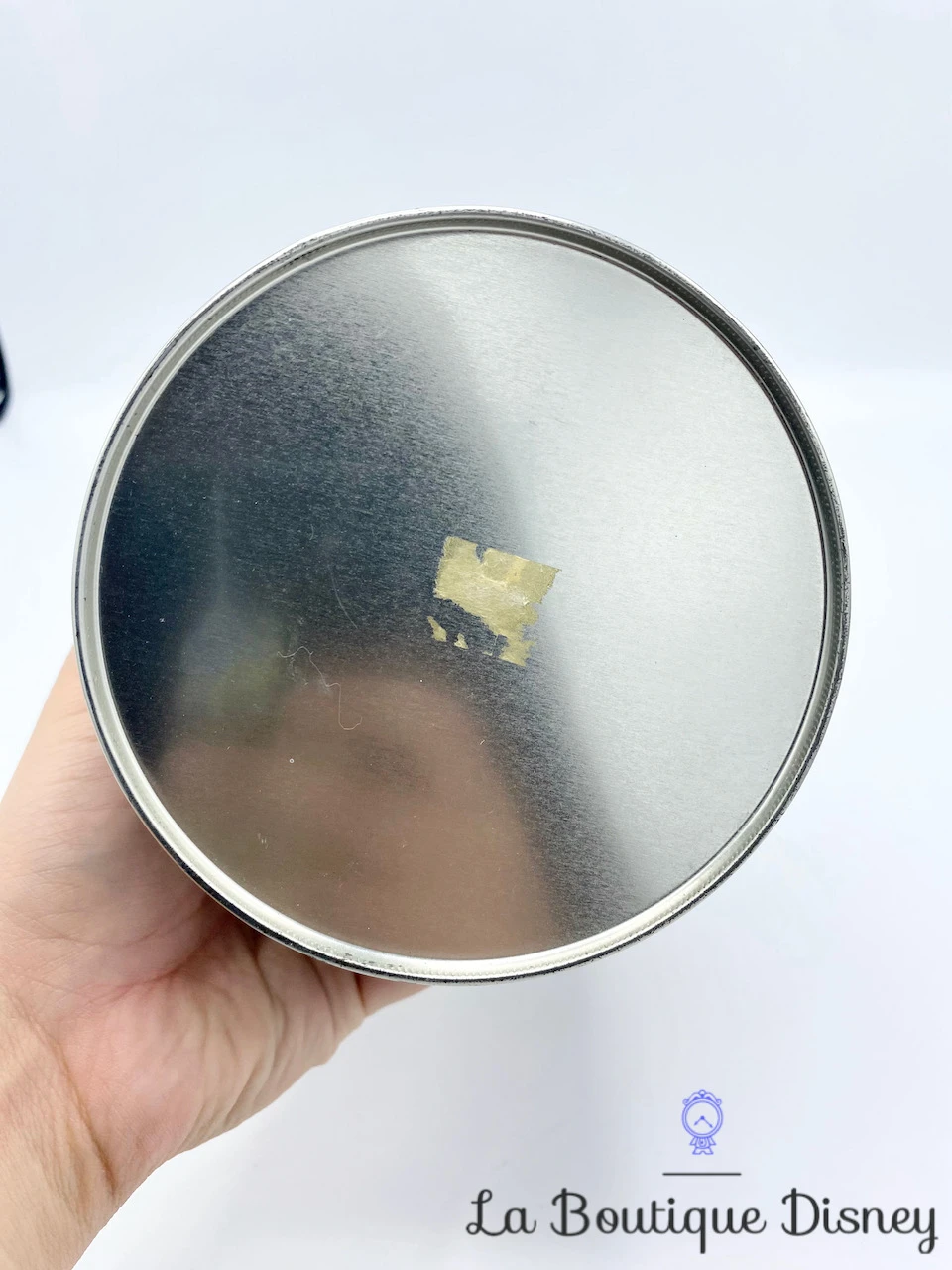 Boite en métal noire de forme ovale représentant Mickey Mouse et Minnie Mouse dans un style rétro vintage. Minnie est habillée en fée / princesse avec un grand chapeau pointu. Elle secoue un moucoir depuis un balcon. Mickey est quant à lui en tenue bleue et rouge avec un chapeau à plume et un ciseau accroché à la taille. Intérieur et dessous de la boite en métal argenté. Sur le couvercle, inscription en rouge « Mickey Mouse Collection ».