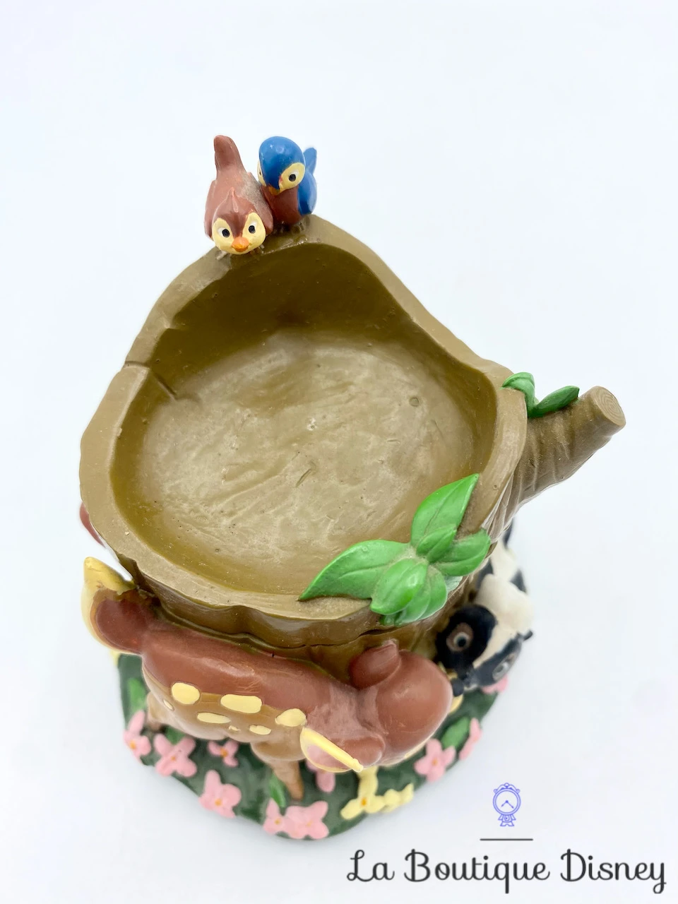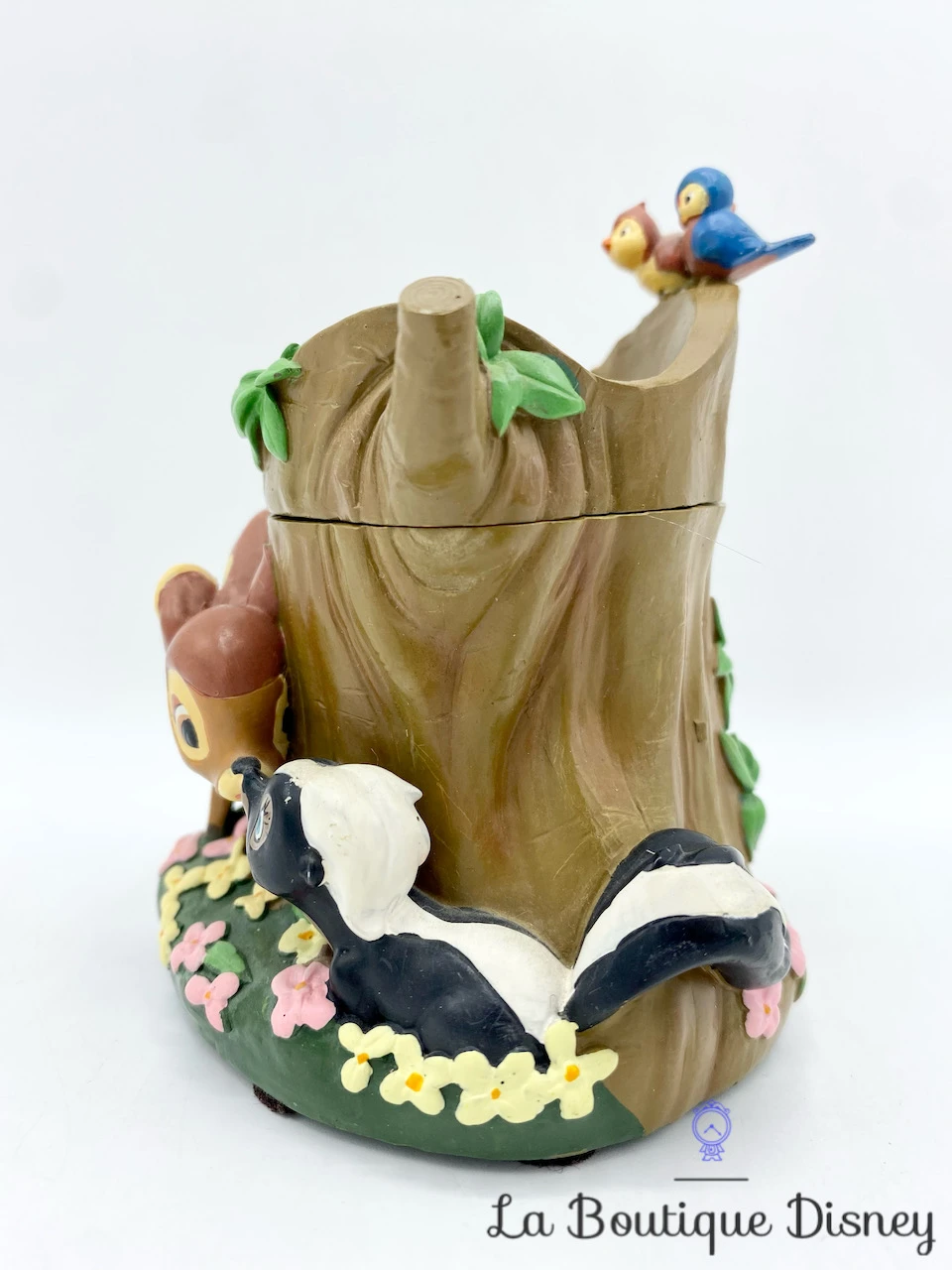 Boite en résine petit format, style « boite à dent » sur le thème du dessin animé Bambi. La boite représente un tronc d’arbre marron. Devant le tronc, se trouvent les deux personnages de Bambi et Fleur la moufette. À l’arrière se trouve Panpan le petit lapin gris en train de rire. Le dessus de l’arbre avec les oiseaux s’ouvre et forme le couvercle de la boite.