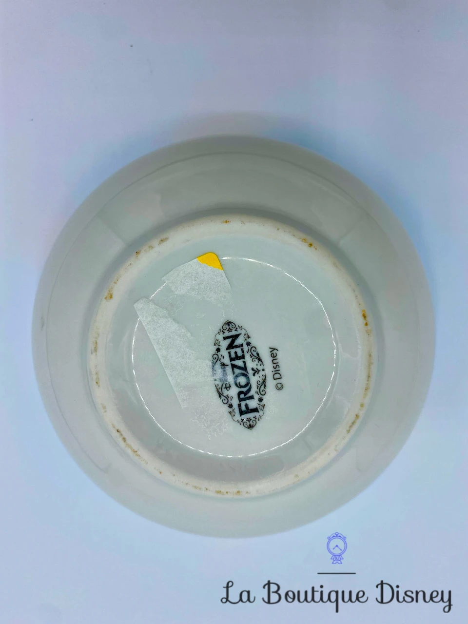 Bol en céramique blanc avec bandeau bleu faisant le tour du bol et sur lequel est représenté les visages des deux soeurs d’Arendelle : Anna et Elsa. Belle qualité des dessins.