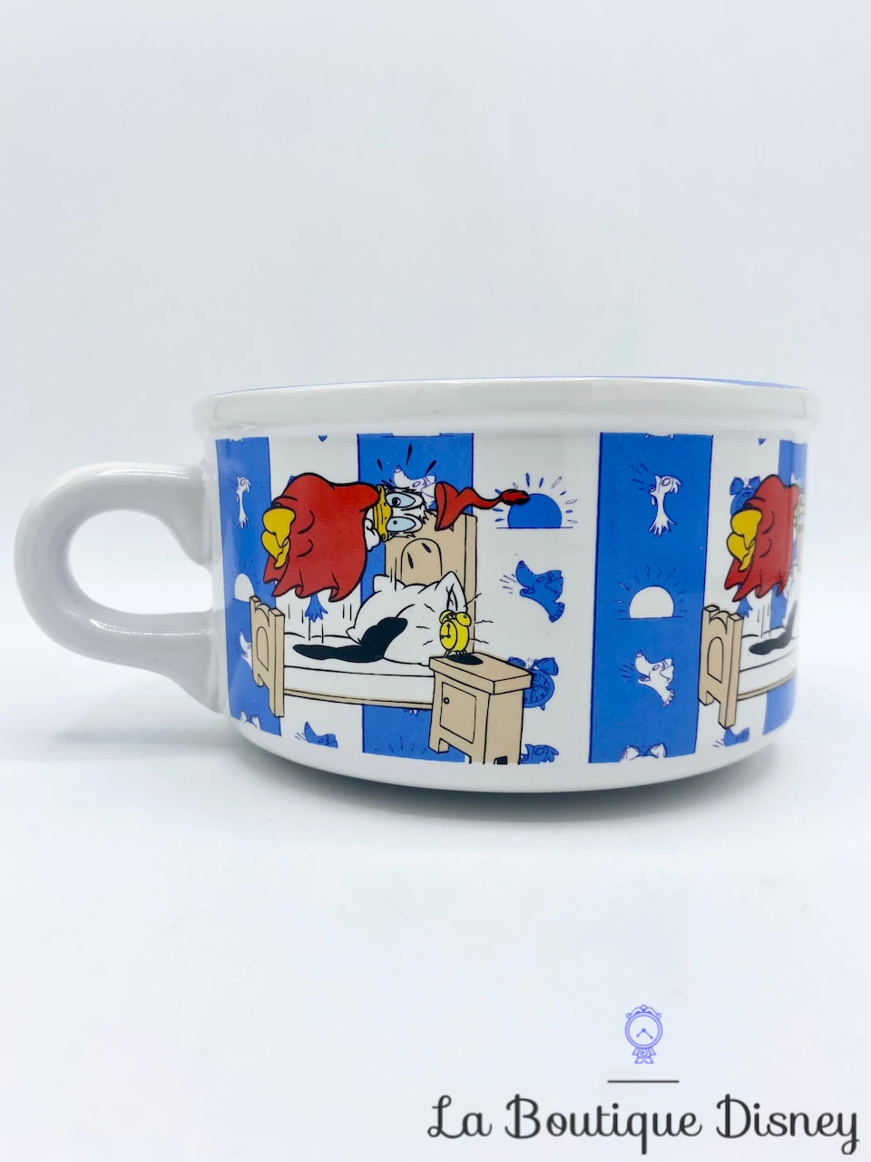 Bol en céramique rayé blanc et bleu représentant le célèbre canard, Donald Duck . Il est représenté cinq fois autour du bol de façon identique à savoir : il y a un lit avec une table de chevet et un réveil qui sonne. Donald est surpris par la sonnerie et fait un bond à l’horizontal au dessus du lit. Il est encore revouvert d’une couverture rouge et d’un bonnet de nuit rouge. Il a d’énormes yeux écarquillés. Sur les rayures bleues, on découvre quelques motifs liés au levé du jour, un coq, un soleil levant et une tête de chien qui aboie. Intérieur du bol et anse blanc.