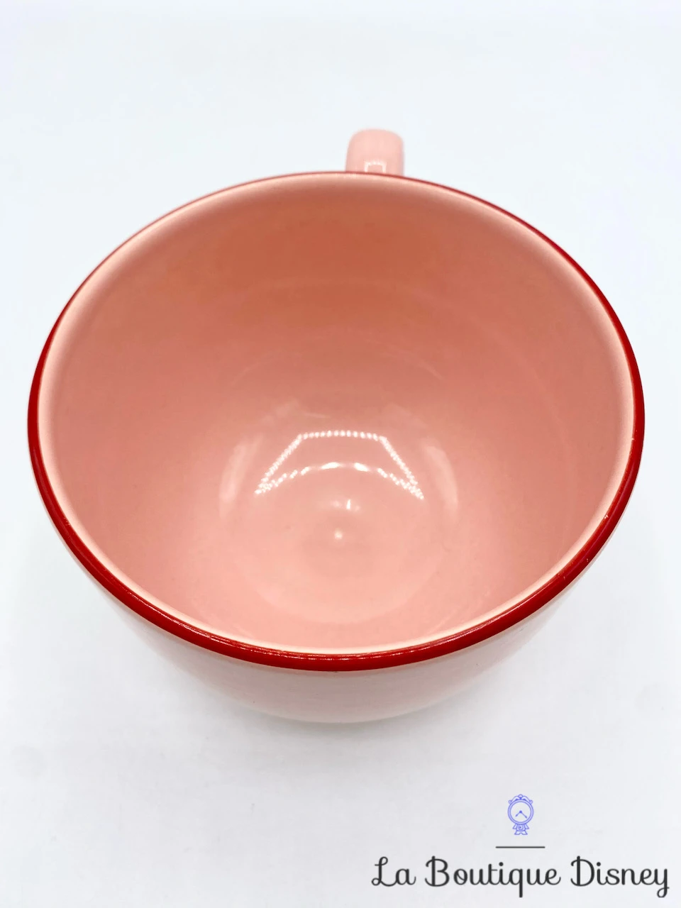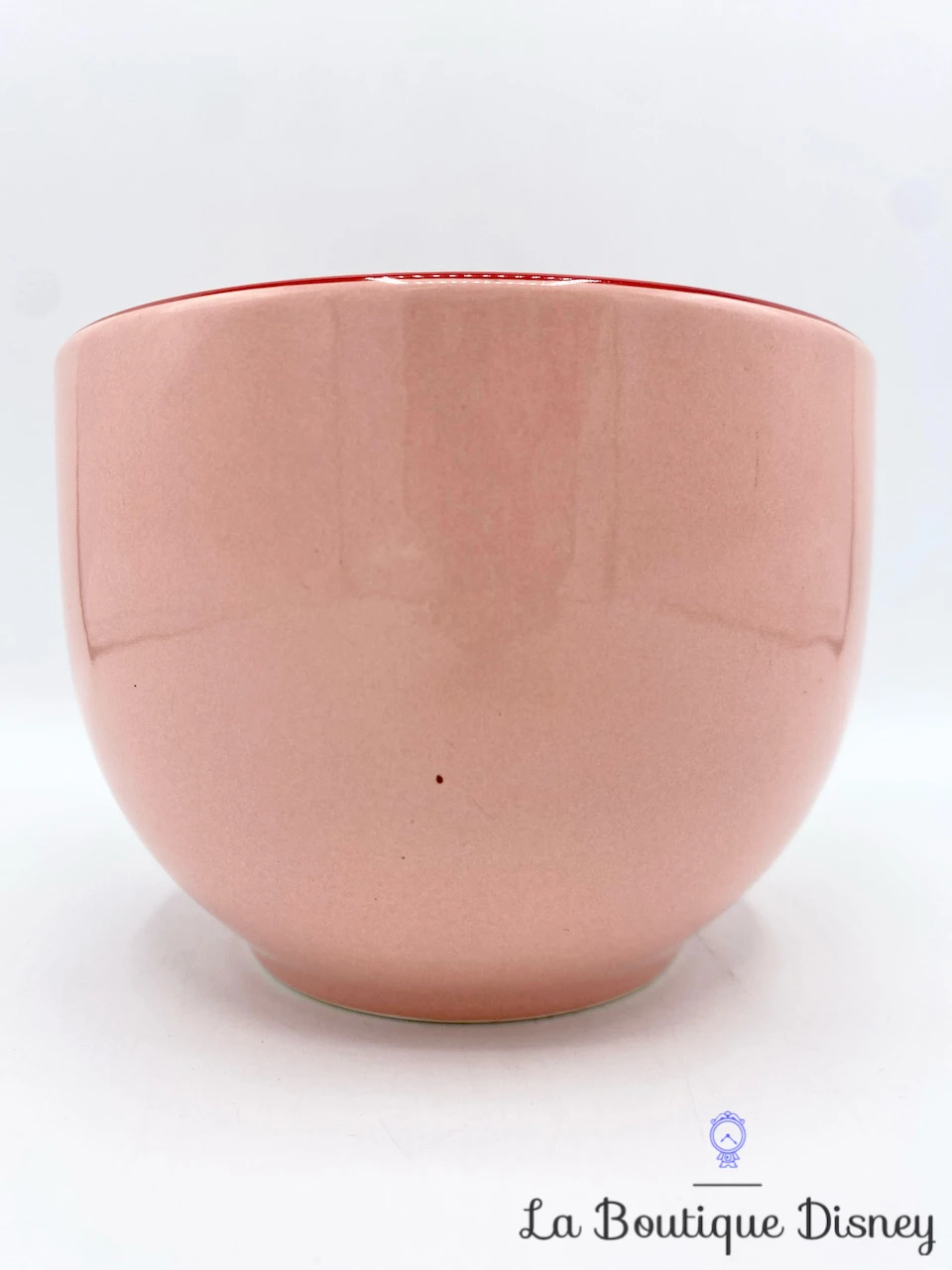 Bol en céramique rose avec la représentation de Minnie Mouse dans un style rétro vintage avec une jupe rouge à pois jaune. Anse et intérieur roses.