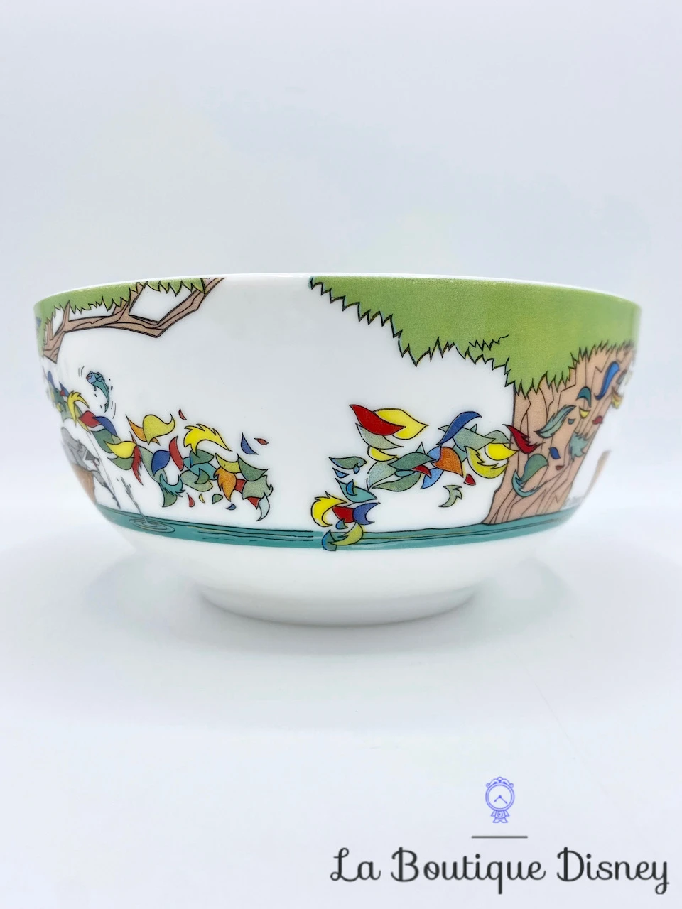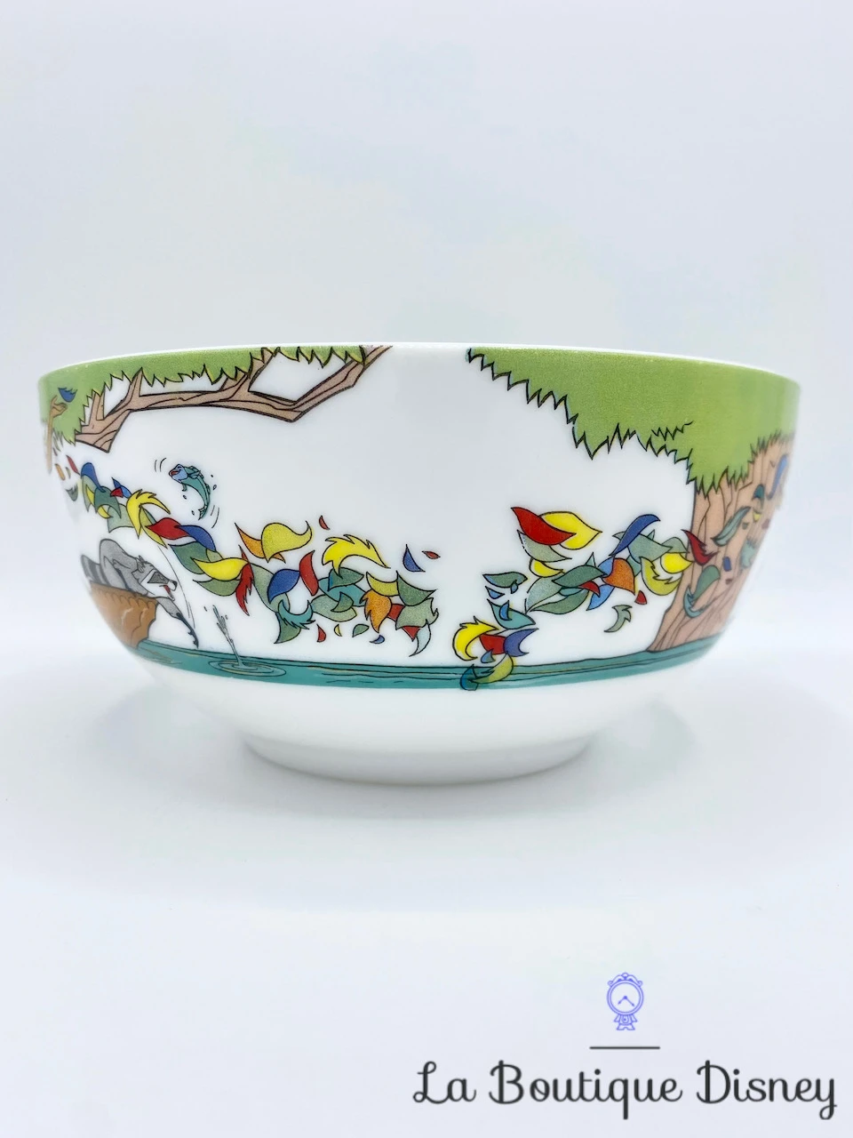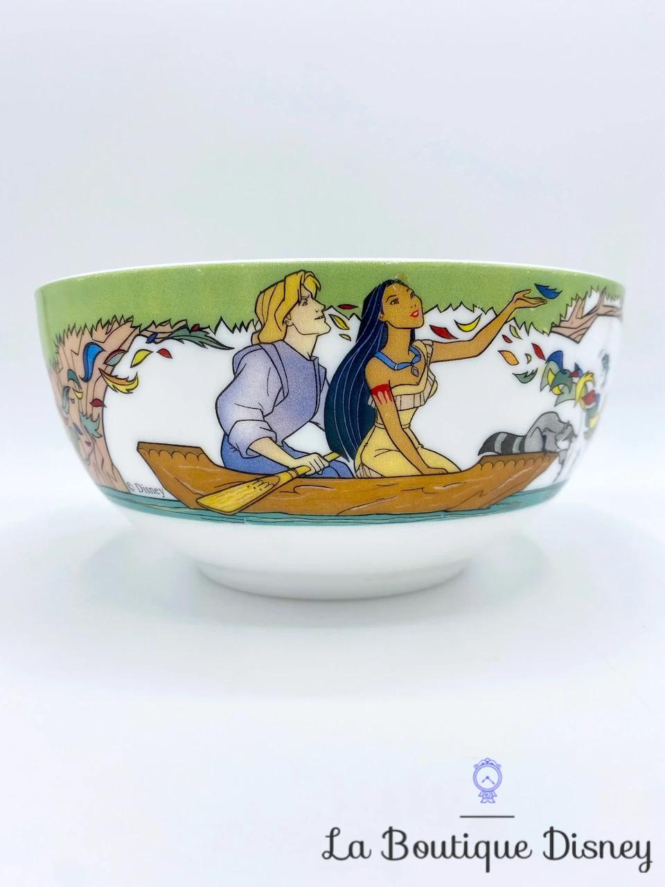 Bol blanc avec tout autour une scène du film Pocahontas : tout d’abord l’indienne Pocahontas est dans une pirogue sur l’eau accompagné de l’anglais John Smith. Au bout du bateau se trouve son plus fidèle compagnon, Meeko. Ils sont en train d’observer la nature, les arbres et les feuilles du « vent » multicolores. Les dessins sont très beaux et les couleurs très bien conservées.