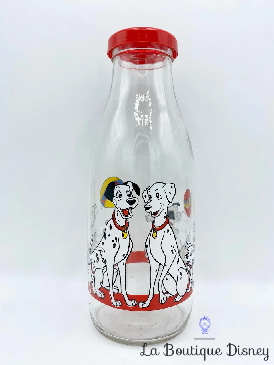 Carafe en verre épais avec motif imprimé de la famille des 101 dalmatiens : il y a Pongo et Perdita et tous leurs petits chiots ! Ils sont en train de jouer avec des ballons jaunes, rouges et bleus. Bouteille fermée par un couvercle en plastique rouge qui se clipse.