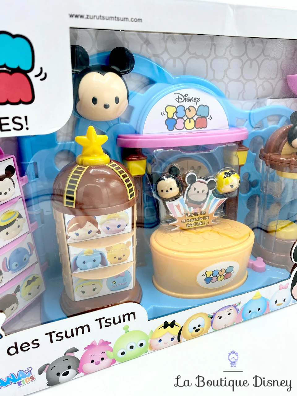 Bienvenue dans le fabuleux monde des Tsum Tsum ! Collectionne-nous tous, empile-nous les uns sur les autres et regarde-nous tomber ! Essaie de trouver les plus rares d’entre nous ! Expose tes Tsum Tsum favoris dans la vitrine amovible, empile-les sur le présentoir et presse le bouton pour les voir sauter ! Positionne ton Tsum Tsum à l’intérieur du tube transparent, presse le bouton et regarde-le s’envoler ! Range ton Tsum Tsum préféré dans le petite globe suspendu rose ! Inclus deux Tsum Tsum exclusifs avec la maison !