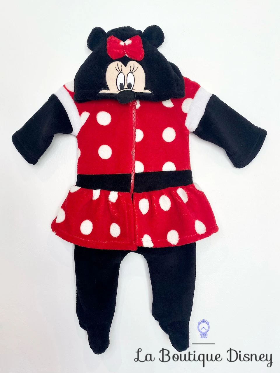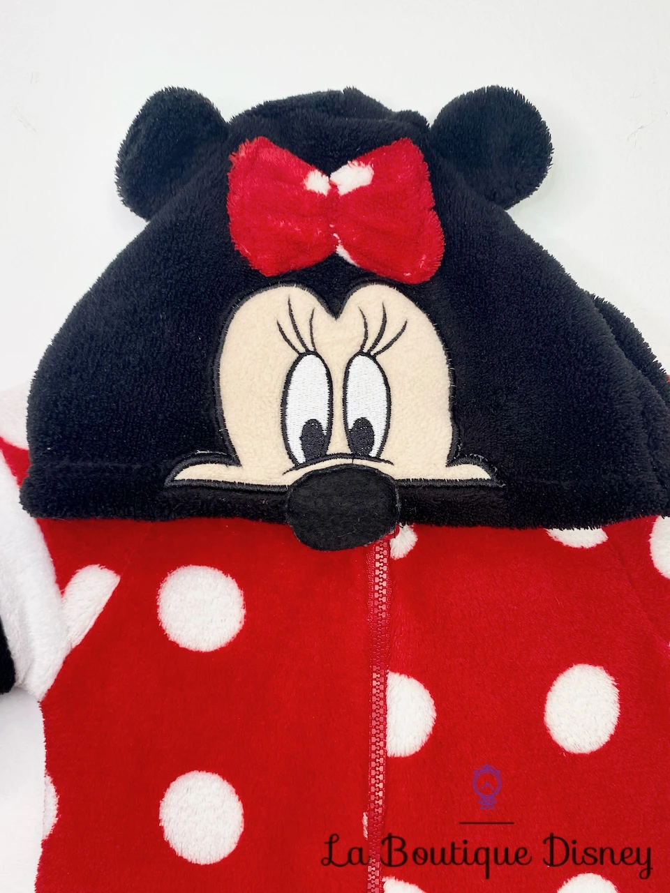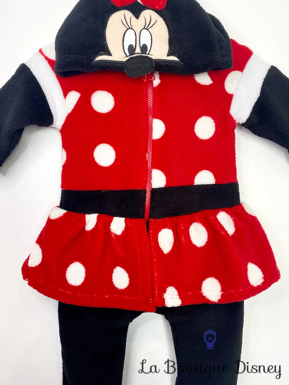 Combinaison en polyester de Minnie Mouse, la célèbre souris compagne de Mickey Mouse ! Combinaison intégrale rouge à pois blancs, fermeture avant grâce à une fermeture éclair, capuche avec la tête du personnage, ses oreilles et son célèbre noeud rouge. Style polaire. Couleurs : noir, blanc et rouge. Jusqu’à 60 cm.
