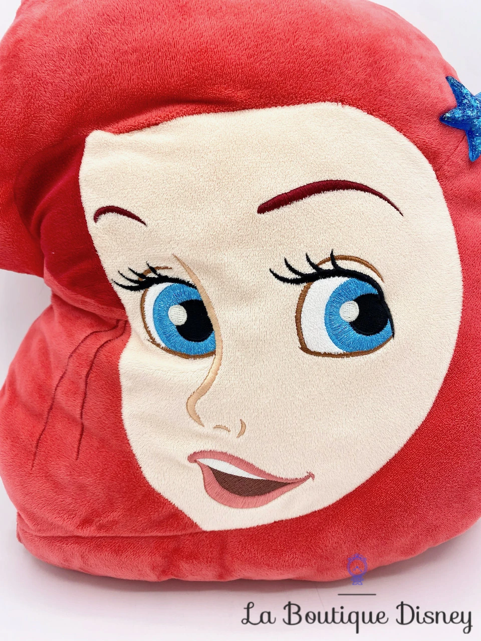 Coussin en matière peluche représentant le visage de la princesse Ariel, la sirène la plus célèbre de l’océan ! Elle a une étoile de mer bleue dans ses cheveux rouges. Tous les détails du visage sont brodés. Dos uni rouge. Oreiller moelleux et confortable.