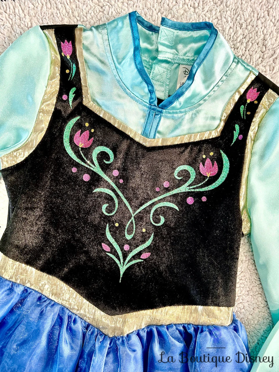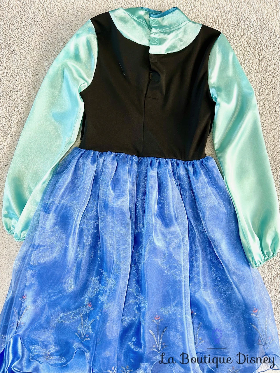 Déguisement en polyester de la princesse Anna représentant sa magnifique robe bleue et noire d’hiver. Manches longues satinées bleu ciel. Devant de la robe en velours noir avec bordures dorées et motifs imprimés à paillettes de fleurs vertes et roses. Jupon de la robe bleu satiné avec des petites roses. Fermeture arrière par des scratchs. Très beau volume de la robe.