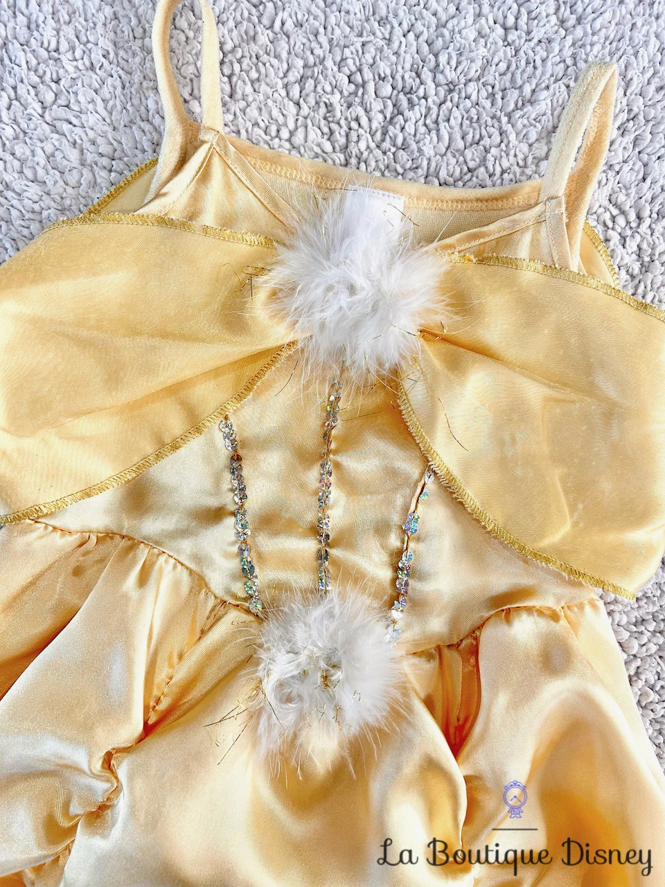 Déguisement en polyester et nylon jaune de la princesse Belle. Robe à bretelles avec des petites plumes blanches sur le devant. Bas de la robe froncé. Sequins dorés.