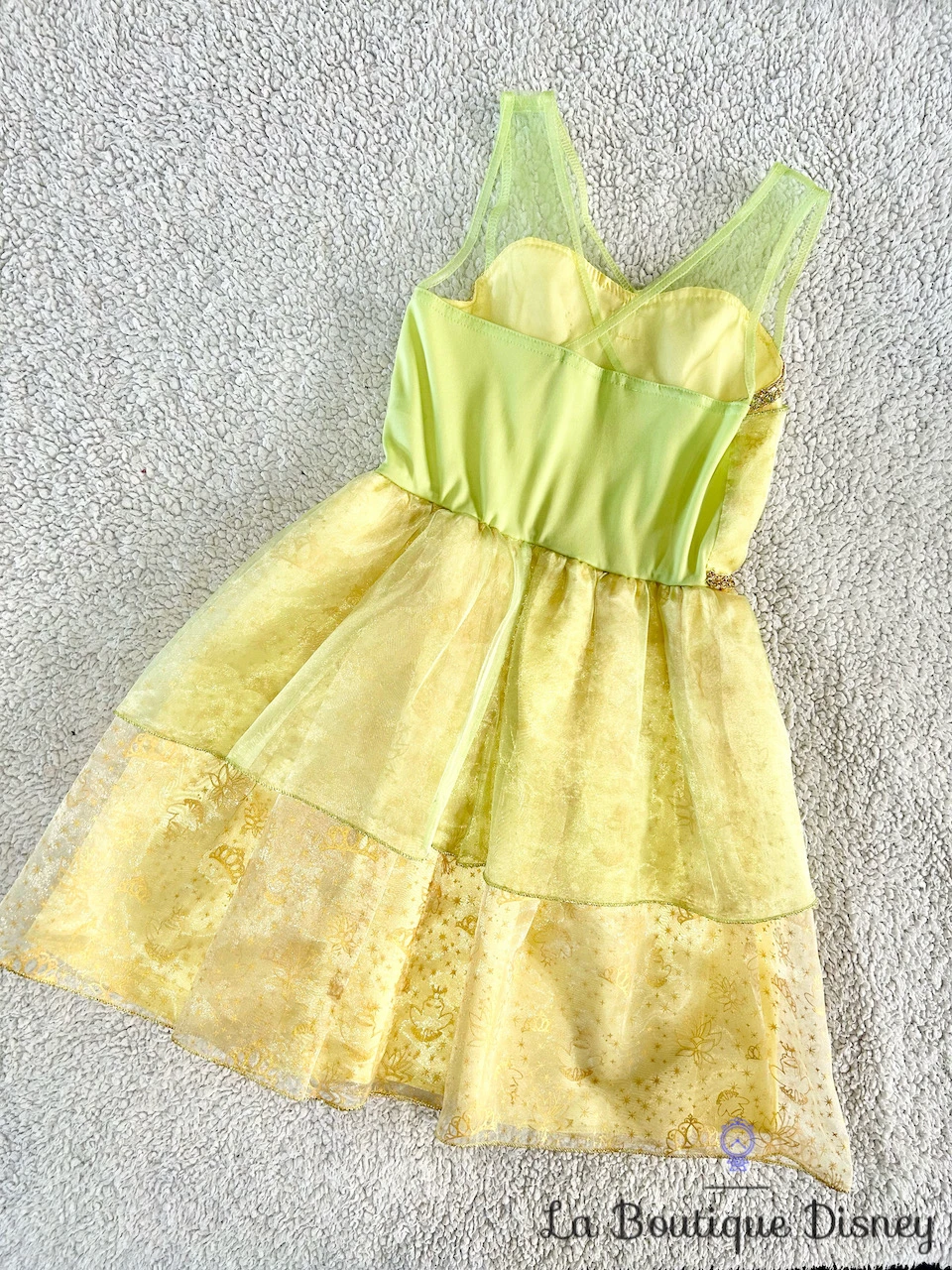 Déguisement de la princesse Tiana. Robe courte à bretelles avec un joli camé à paillettes sur le devant. Voile jaune imprimé avec des motifs de grenouilles, de couronnes et de fleurs. Déguisement de très belle qualité.