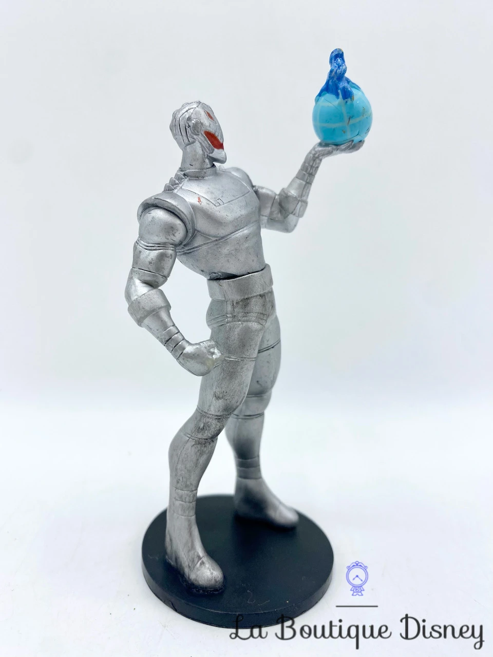 Figurine en plastique d’Ultron, un programme de maintien de la paix d’intelligence artificielle créé par Tony Stark à l’aide du code dérivé de la pierre de l’Esprit enfermée dans le sceptre de Loki. Il a une combinaison argenté, des yeux robes et tient dans sa main un globe bleu.