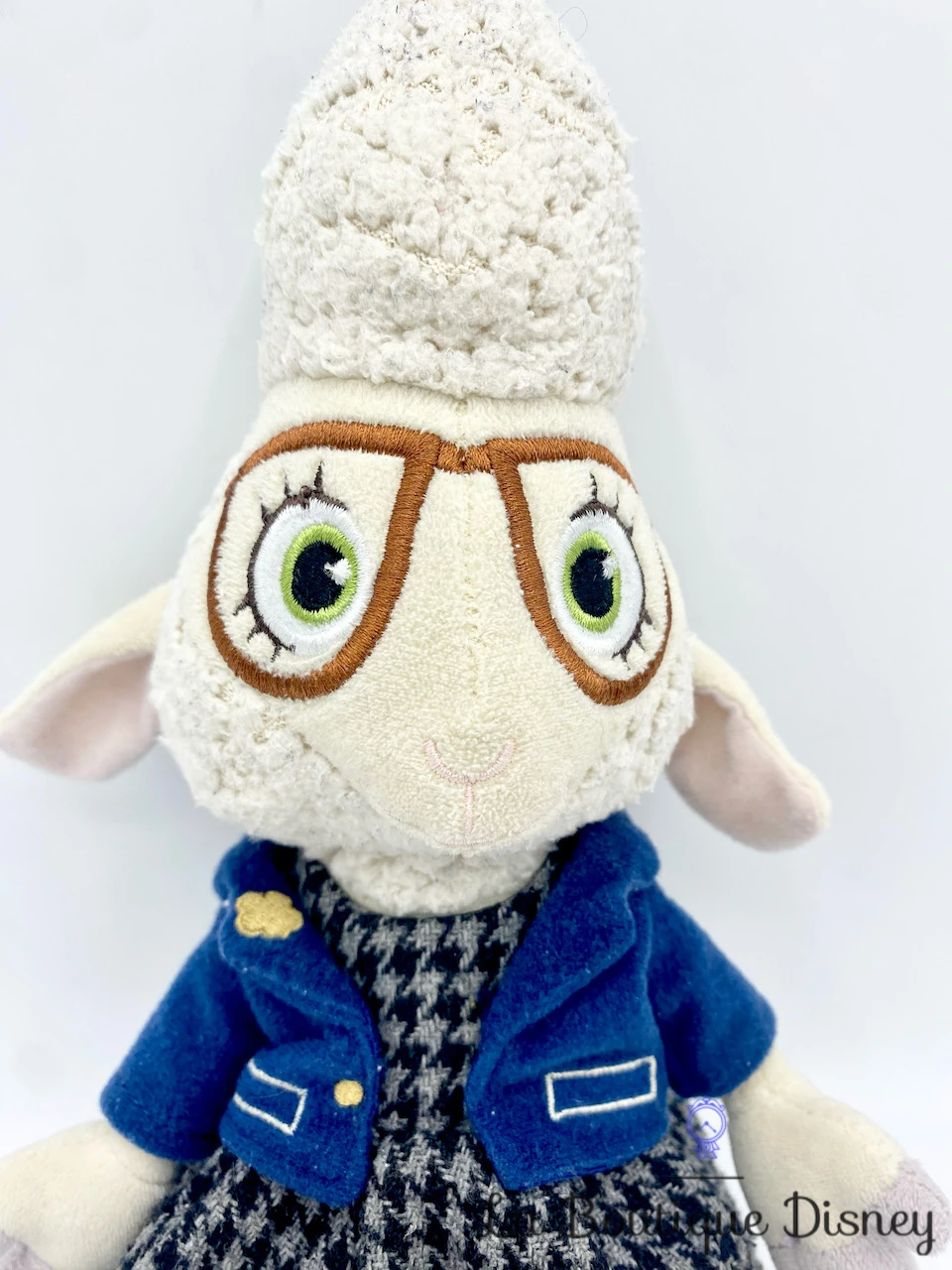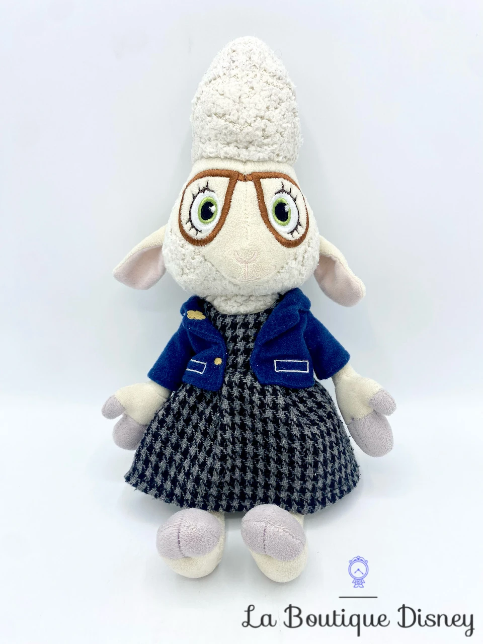 Peluche en fibres de polyester de Dawn Bellwether, l’assistante du Maire Lionheart dans la ville de Zootopie. C’est un petit mouton qui semble très gentil au premier abord ! Elle est en réalité la méchante du dessin animé et reponsable des animaux disparus redevenus sauvages. Elle porte robe grise et noire avec une petite veste bleu. Dawn Bellwether a un joli visage brodé avec des lunettes marron.
