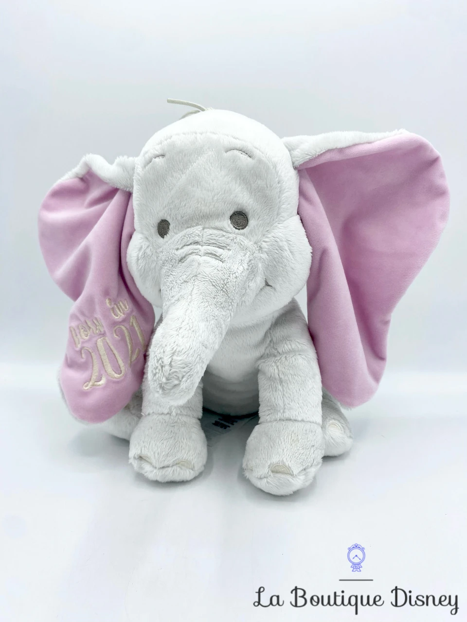 Peluche gris clair du plus célèbre des éléphants, Dumbo version bébé ! Il a de très grandes oreilles avec l’intérieur rose et une broderie « Born in 2021 ». Les détails du visage sont également brodés. Il est en position assise, a trois poils sur la tête et une petite queue. Cette peluche très douce sera parfaite pour accueillir le nouveau né dans la famille !