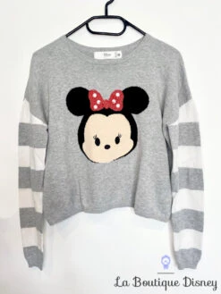 Pull fin 100% coton cropped (court) sur fond gris à l’effigie de la plus célèbre des souris Minnie Mouse. Son visage est représenté de façon « Tsum Tsum ». Elle porte son noeud rouge à pois blanc, il est légèrement pailleté. Manches longues à grosses rayures grises et blanches, finition cotelée sur toutes les extrémités pour une meilleure tenue du pull. Dos uni.