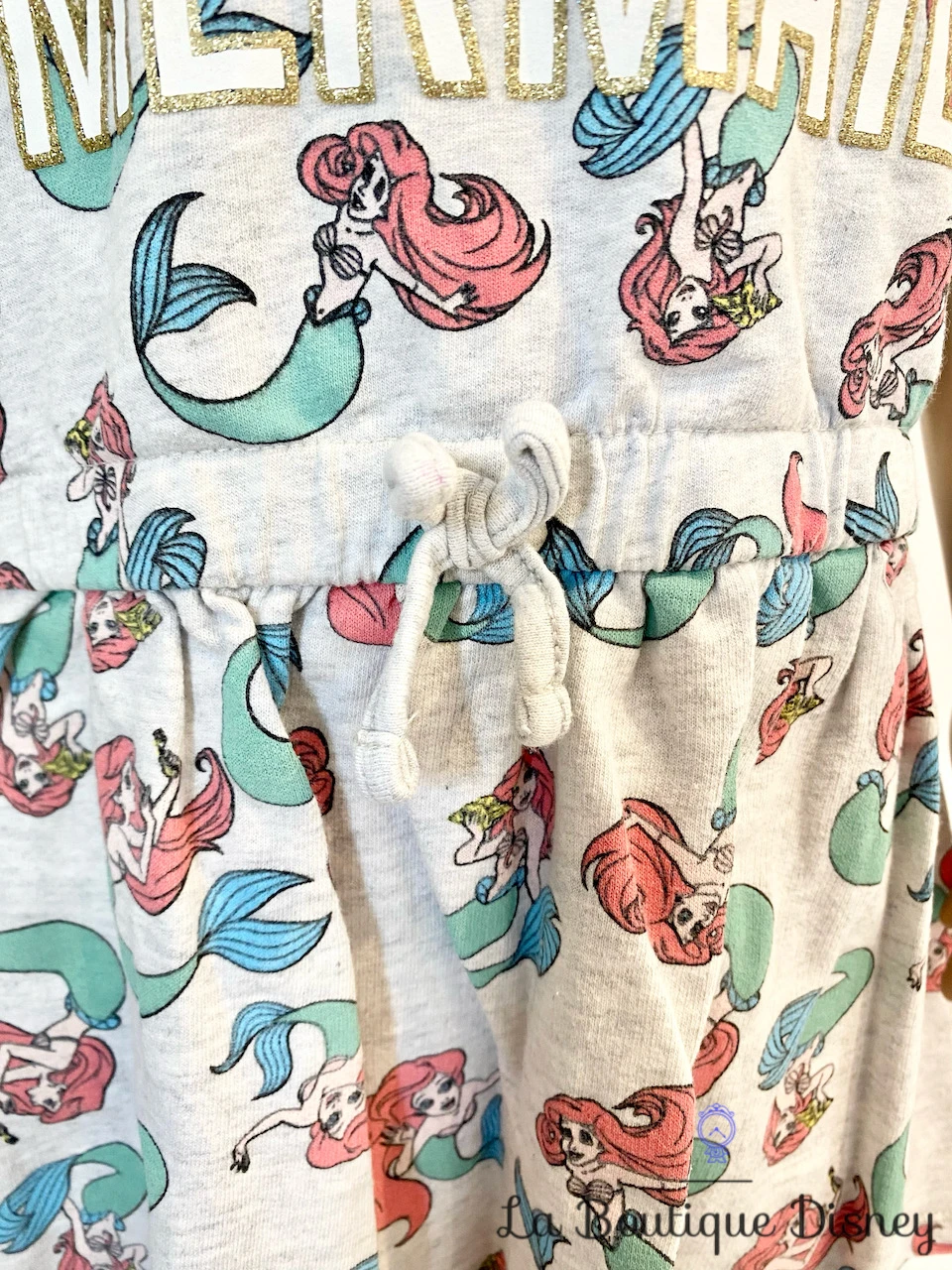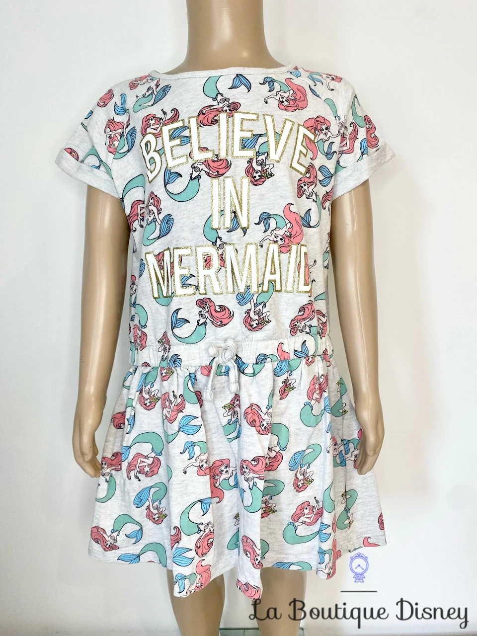 Robe grise à manches courtes. Motifs de la petite sirène, Ariel à de multiples reprises sur l’intégralité de la robe. Serrage par un cordon à la taille pour une plus jolie coupe. Inscription imprimée « Believe in Mermaid » en blanc et or sur le devant.