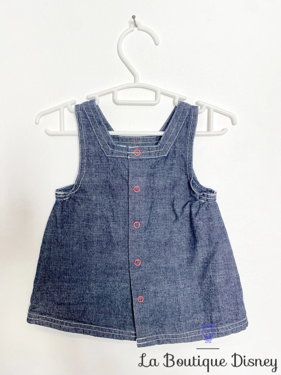 Robe 100ù coton avec effet jean sans manche. Petit noeud rose sur le devant. Broderie de Winnie l’ourson en blanche et rose avec inscription « Pooh ». Fermeture arrière par 5 boutons pressions.