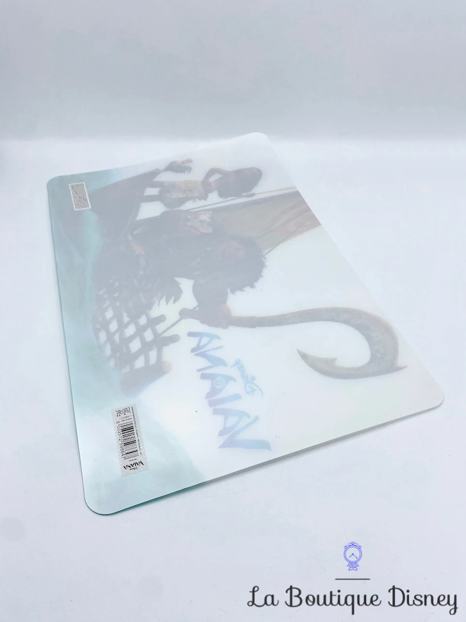 Set de table en plastique représentant Vaiana, la princesse aventurière sur sa pirogue. Elle est accompagnée de Maui, le demi-dieu tatoué, de Pua, son ami le petit cochon blanc et de Hei Hei le coq aux couleurs multicolores. Ils ont l’air de glisser sur l’eau, prêts à partir à l’aventure ! Inscription « Disney Vaiana » sur le côté gauche.