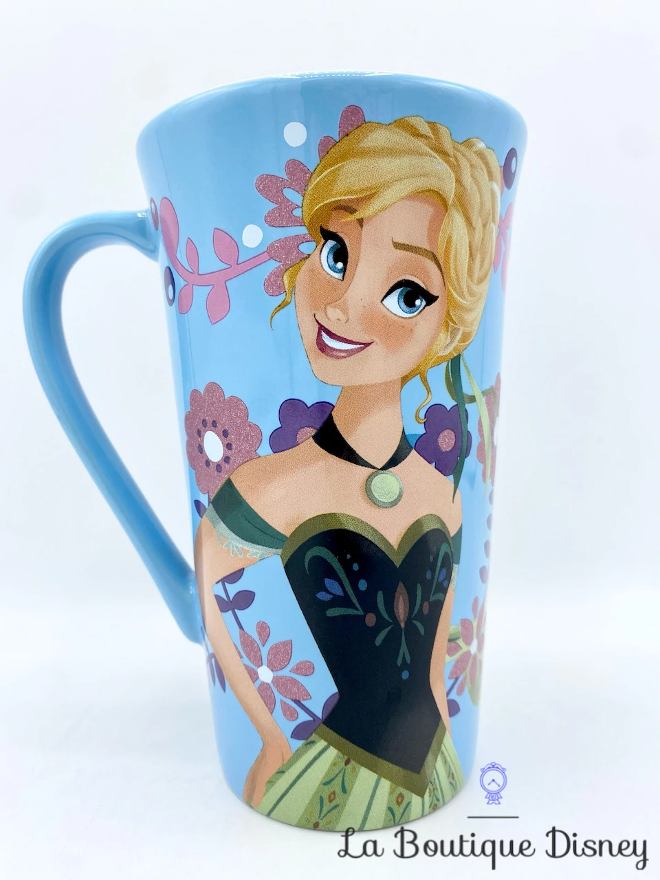Mug en céramique bleu de la princesse Anna d’Arendelle. Elle est représentée deux fois, une fois de face et une fois assise. Elle porte sa robe verte et noire du dessin animé. Tout autour de la tasse, il y a de très belles fleurs violettes, roses et jaunes. Intérieur blanc. Anse bleue. Tasse grand format très haute !