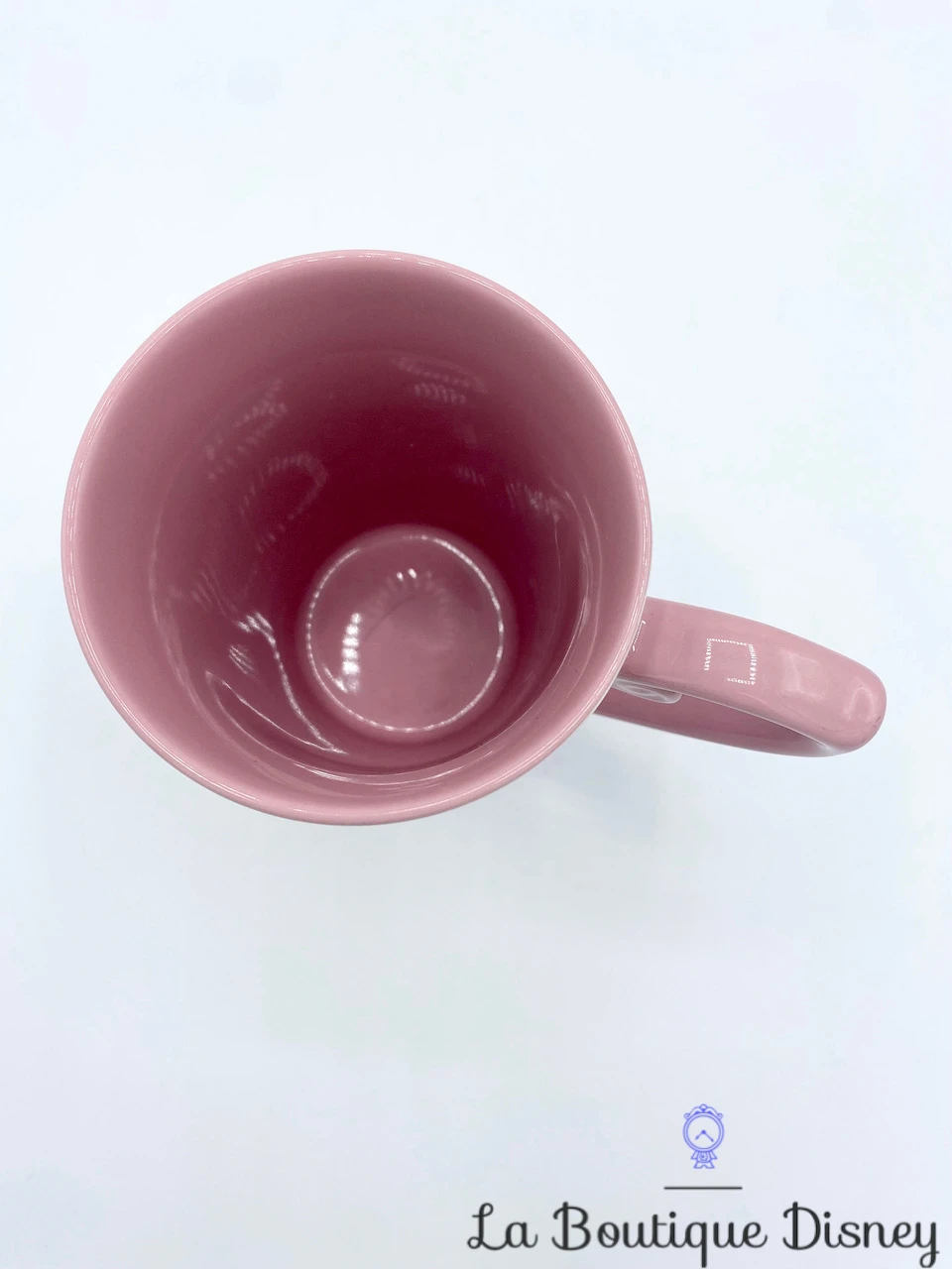 Mug en céramique blanc et rose. Sur la première face, portrait de la princesse Aurore avec ses longs cheveux blonds dans une magnifique robe de bal rose à paillettes. Elle est représenté dans un cadre rose. Sur l’autre face, Aurore est cette fois ci dans sa tenue de sirène, debout, tenant une rose à la main. À côté d’elle, en rose, il y a l’inscription « Heart Full of Song ». Tout autour, il y a des motifs roses de couronnes et des ses trois marraines les fées, Flora, Paquerette et Pimprenelle. Anse travaillée rose. Intérieur de la tasse rose également.