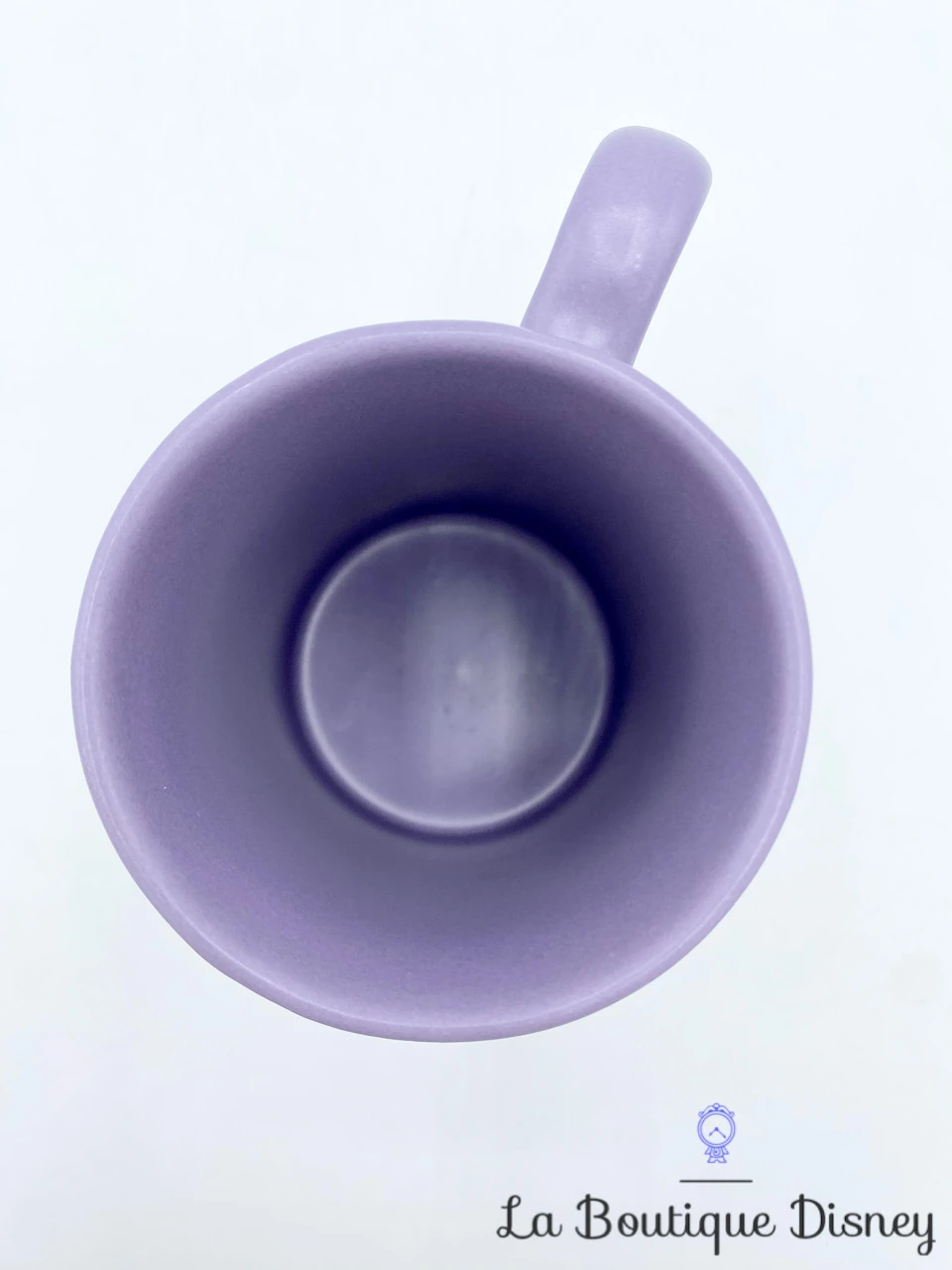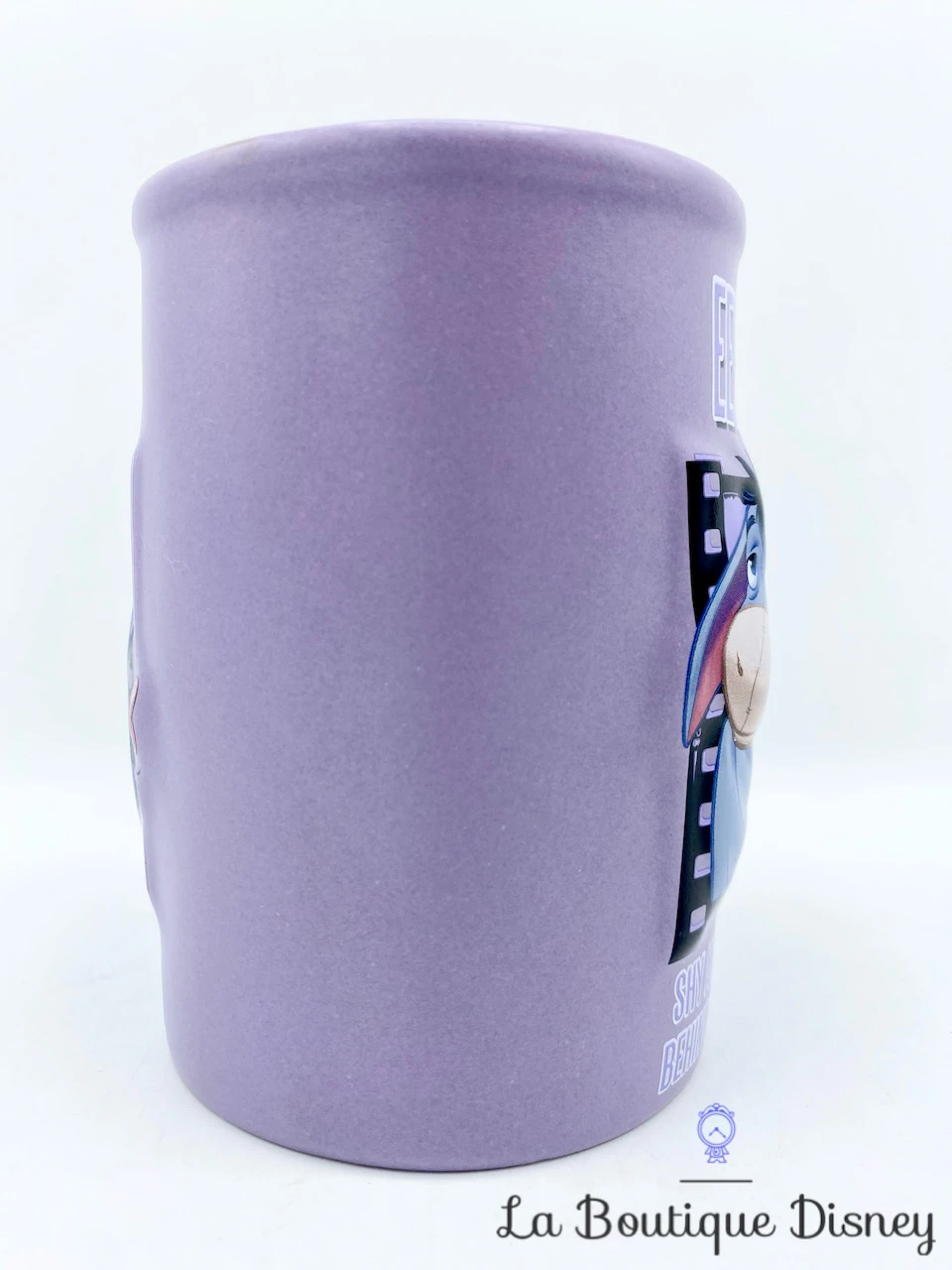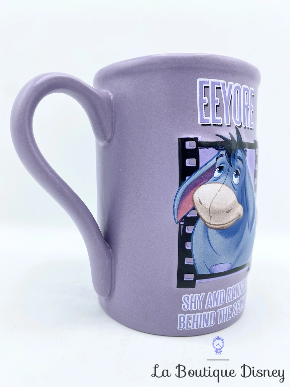 Mug en céramique violet représentant l’âne bleu, Bourriquet. Il est représenté dans une bande de film de cinéma. Il y a les inscriptions « EEYORE » et « Shy and Retiring – Behind the scenes » en violet et blanc. Les deux faces de la tasse sont identiques. Anse et intérieur violets.