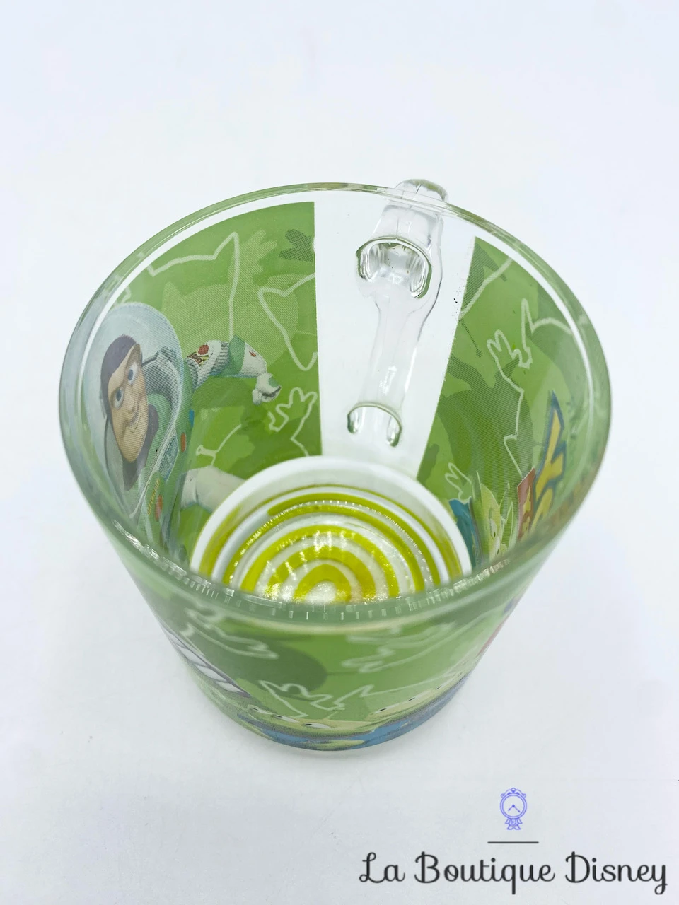 Tasse transparente avec un imprimé vert sur le thème de Toy Story. On peut y voir trois petits aliens extraterrestres ainsi que Buzz l’Éclair, le space ranger de l’espace. Un tourbillon vert sous le mug permet l’effet anti dérapant. Anse transparente.