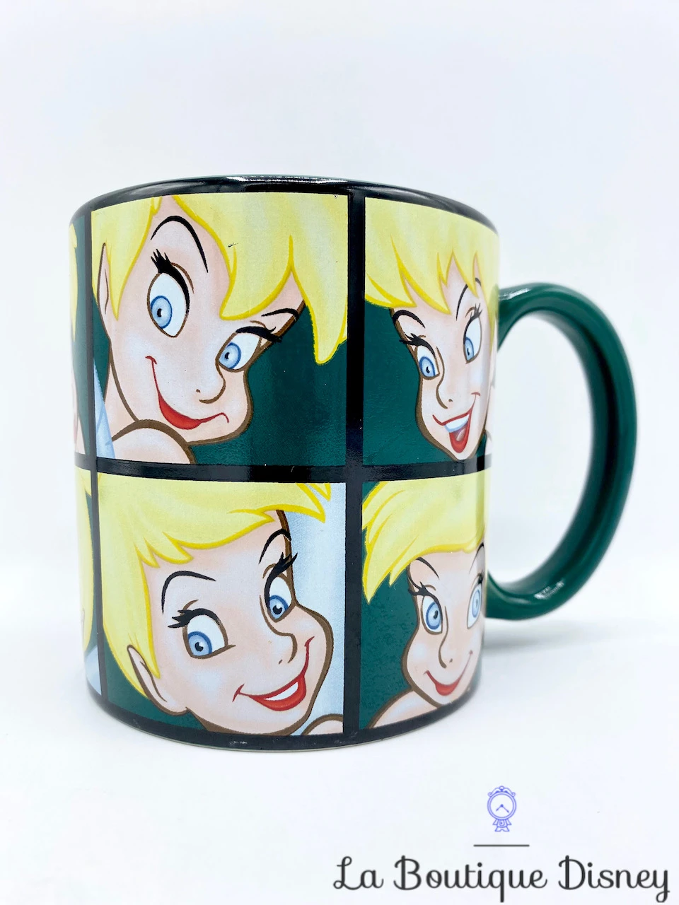 Mug en céramique vert foncé sur le thème de la Fée Clochette. La portrait de la petite fée est représentée dans huit carrés. Elle exprime différentes humeurs sur son visage, boudeuse, étonnée, heureuse, charmeuse… Anse et intérieur verts. Tasse grande capacité XXL.