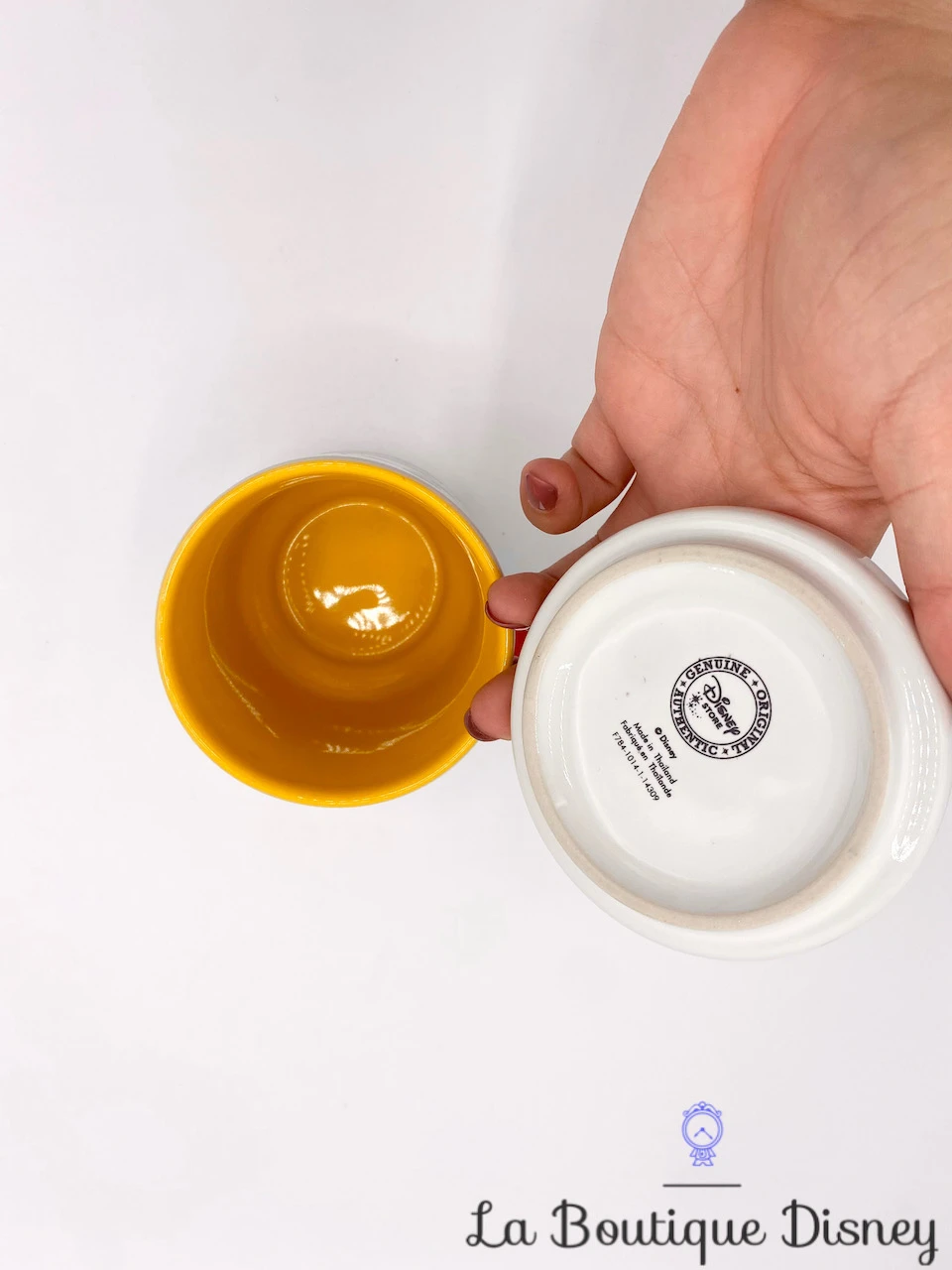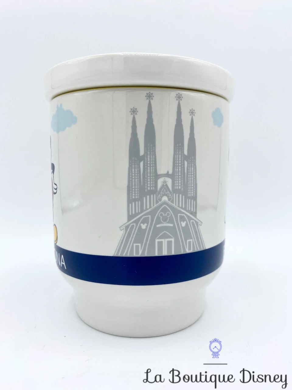 Mug en céramique blanc avec la représentation de la célèbre souris Mickey Mouse dans un style rétro vintage. En dessous de lui, il y a l’inscription du nom d’une ville en Espagne « Barcelona ». Sur l’autre coté du mug se trouve la représentation de l’un des monuments les plus connus du pays La Sagrada Familia. Sur le dessus du couvercle de la tasse on y retrouve l’inscription « Barcelona » mais aussi la Sagrada Familia en arrière plan. En plus, il y a la présence d’un bus de deux étages rouges avec à l’intérieur des amis de Mickey comme Dingo ou Daisy. Sur le bus il y a l’inscription » Barcelona Mickey’s city tours 1928″. En haut se trouve également 5 drapeaux de l’Espagne qui sont acrrochés à une corde. L’intérieur de la tasse est jaune, la anse rouge et le dessous du couvercle blanc.