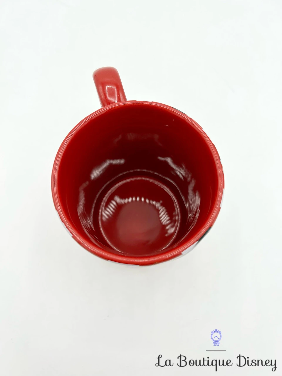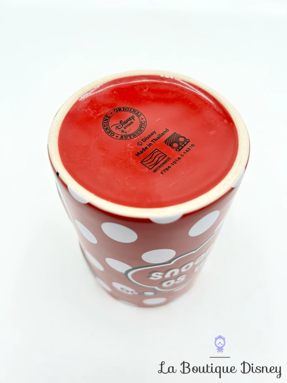 Mug en céramique rouge à pois blancs représentant notre souris préférée, Minnie Mouse en gros plan. Elle porte son noeud habituel et a sa tête posée entre les mains. Au dos de la tasse, inscription « I am so gorgeous ». Anse et intérieur rouges.