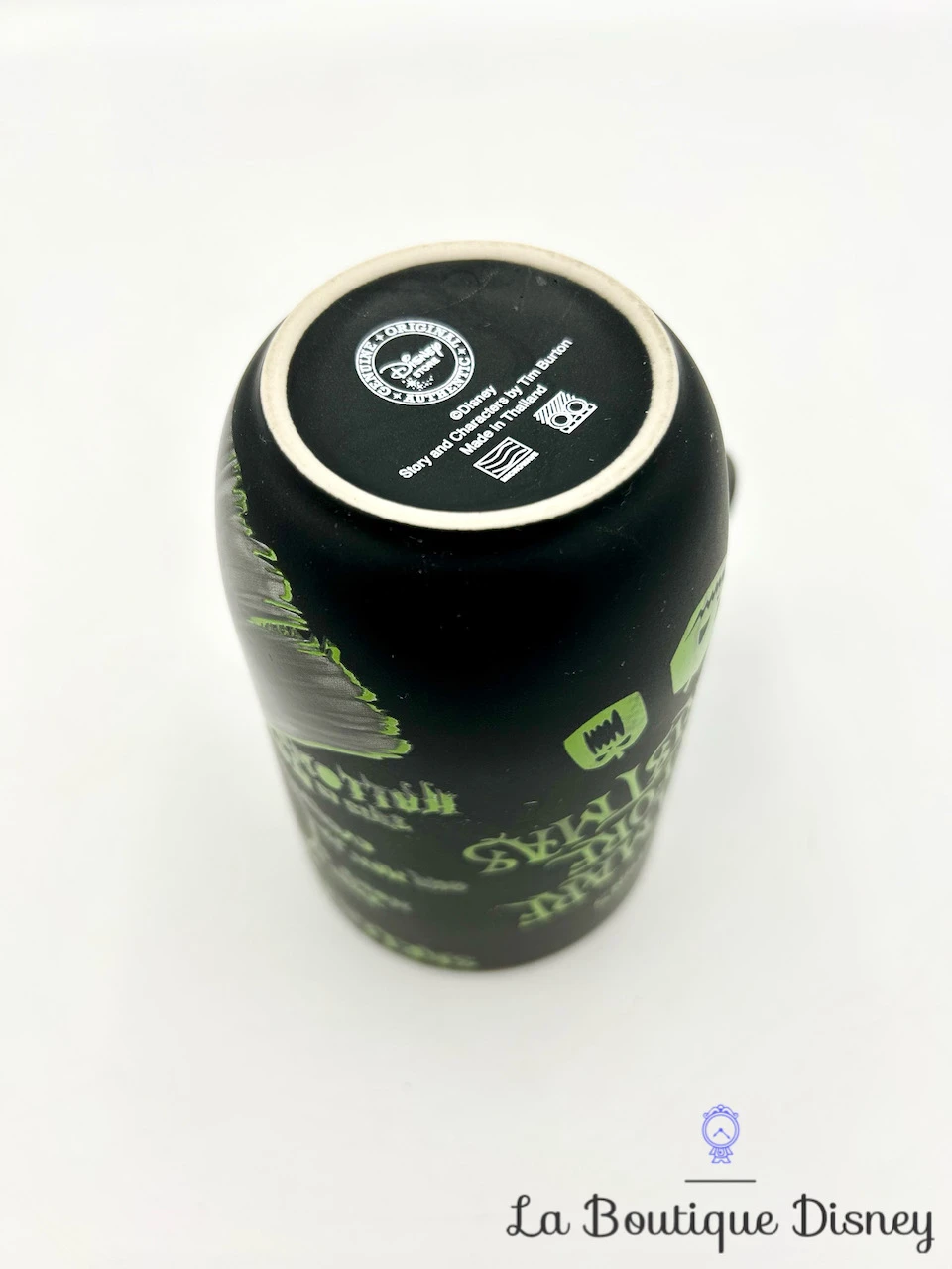 Mug en céramique noir et vert représentant le portrait de Sally, la poupée chiffon créée de toute pièce par le Docteur Finklestein et amoureuse de Jack Skellington. Tout autour d’elle, il y a de nombreuses inscriptions vertes et notamment le mot « Halloween ». De l’autre côté de la tasse, inscription « Tim Burton’s The Nightmare Before Christmas » accompagnée de trois citrouilles. Mug grande capacité. Anse noire et intérieur vert.