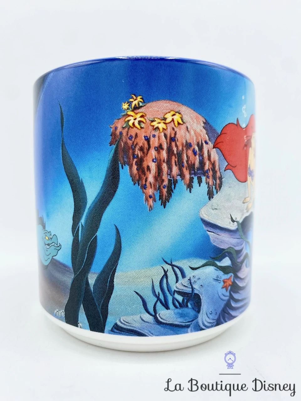 Mug en céramique vintage représentant une scène du dessin animé La Petite Sirène. Ariel, la princesse aux cheveux rouges est dans sa tenue de sirène avac sa queue verte et son soutien gorge en coquillage violet. Elle est sur un rocher et son ami Polochon le poisson jaune et bleu est près d’elle. Sébastien le crabe rouge, conseillé du roi et chargé de surveiller la princesse les regardent. Dans la continuité de la scène, on retrouve Ursula la sorcière des mers à l’apparence de pieuvre noire. Elle est dans son repère en train de se regarder dans un miroir, accompagnée de ses deux murènes Flotsam et Jetsam. Décors marins sur le pourtour, algues, coquillages, sable et fond bleu, couleur de l’océan. Anse blanche, intérieur bleu.