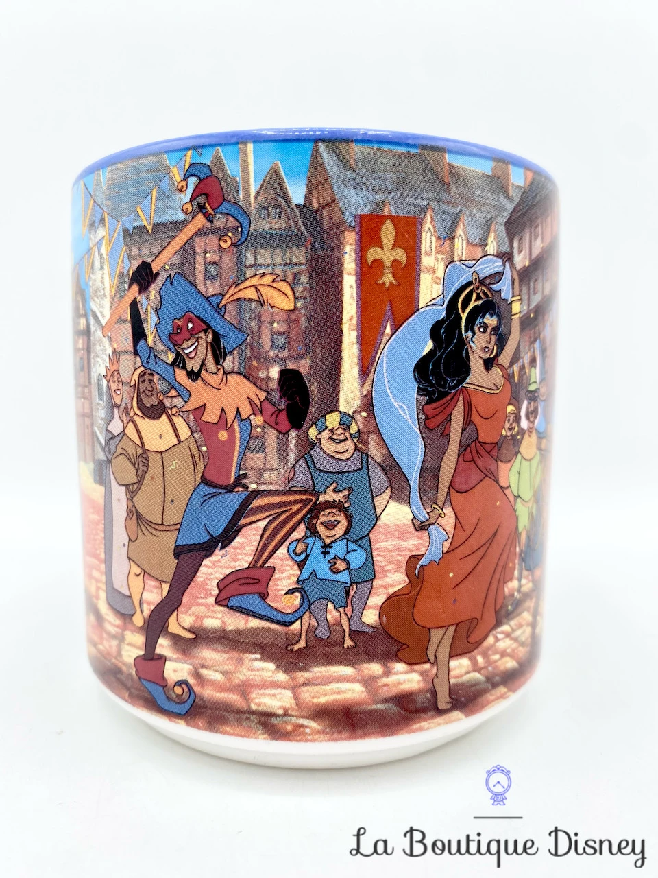 Mug en céramique représentant une scène du dessin animé Le Bossu de Notre Dame. Quasimodo vêtu d’une cape rouge et orné d’une courronne de fou est assis dans une chaise, porté à bras d’hommes devant la foule. Djali, la chèvre, amie de la gitane est juste en dessous. Derrière eux, Esmeralda portant sa robe rouge ainsi que Clopin et d’autres habitants de Paris suivent gaiement le cortège. Phoebus vêtu de son armure, monté sur son cheval ferme la marche du défilé. Intérieur bleu, anse blanche.