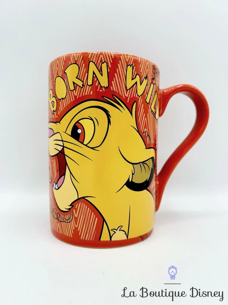 Mug en cĂ©ramique rouge et jaune avec des rayures reprĂ©sentant sur les deux faces, le visage de Simba, le jeune lionceau. En dessous de lui est Ă©crit son prĂ©nom. Sur l’autre face du mug, Simba est en train de crier de toute ses forces. Au dessus de lui est notĂ© en jaune « Born Wild ». Des dessins en noirs du petit lionceau sont prĂ©sents sur l’entièretĂ© du mug. Anse et intĂ©reur rouges.