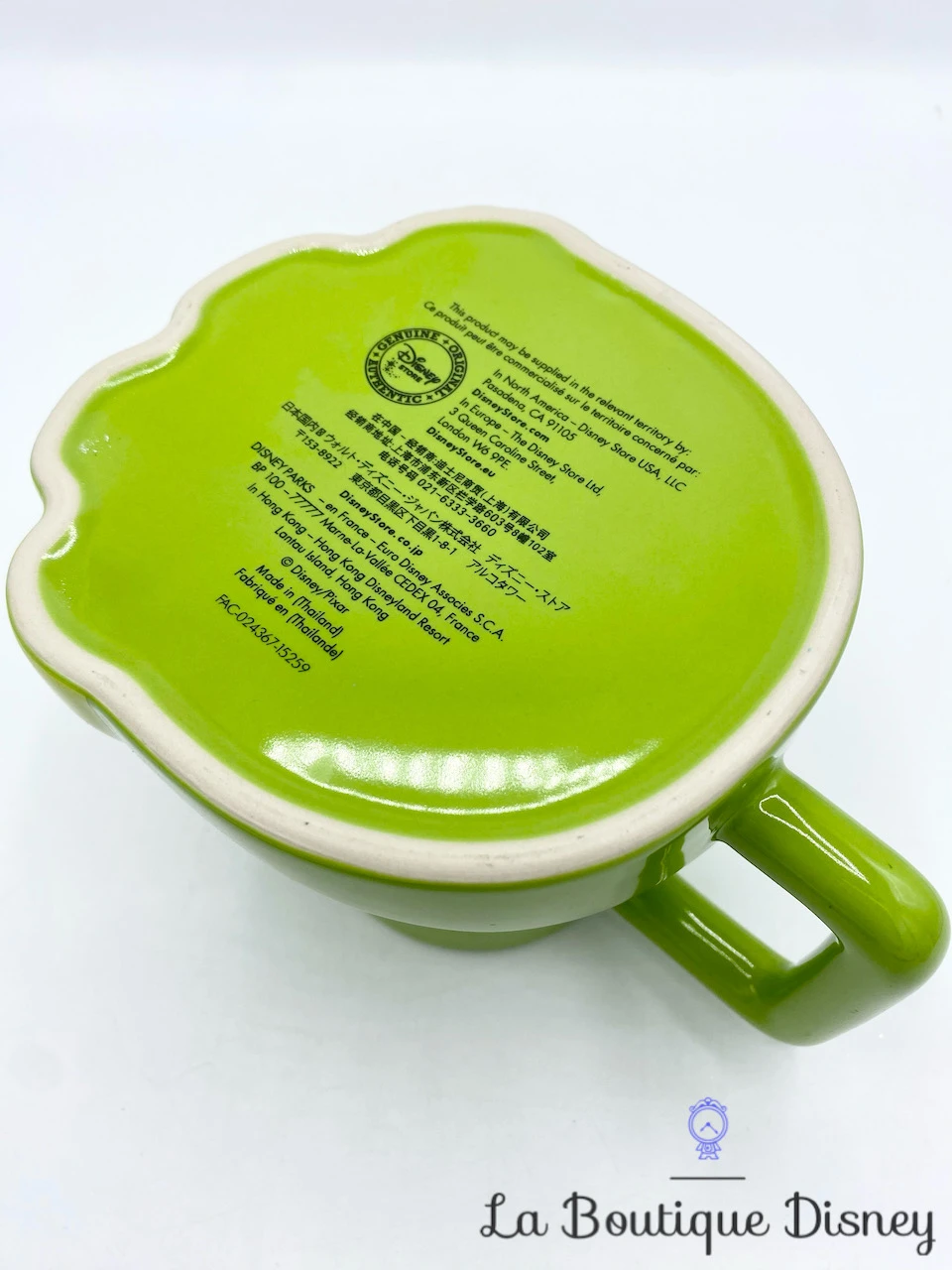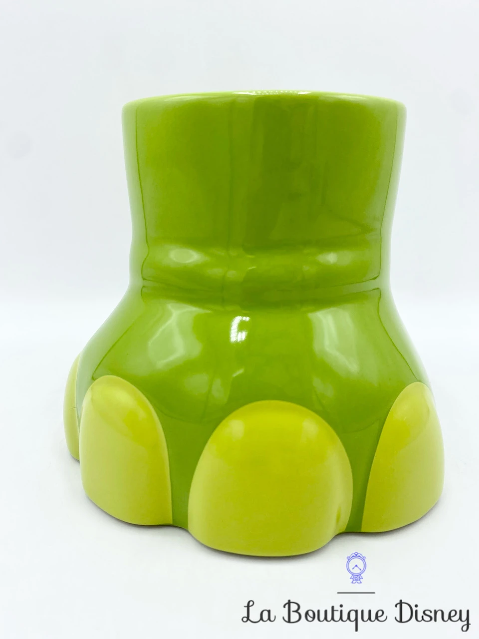 Mug en céramique vert en relief 3D représentant le pied d’Arlo, le dinosaure vert Apatosaurus ami de Spot. Sur le bas de la tasse, se trouvent les quatre ongles de sa patte. Il y a également sur le côté la représentation de Spot, enfant préhistorique avec sa culotte en feuilles marron. Il a de grands yeux verts et arbore un large sourire. Il a des cheveux marron en pagaille. Anse et intérieur verts.