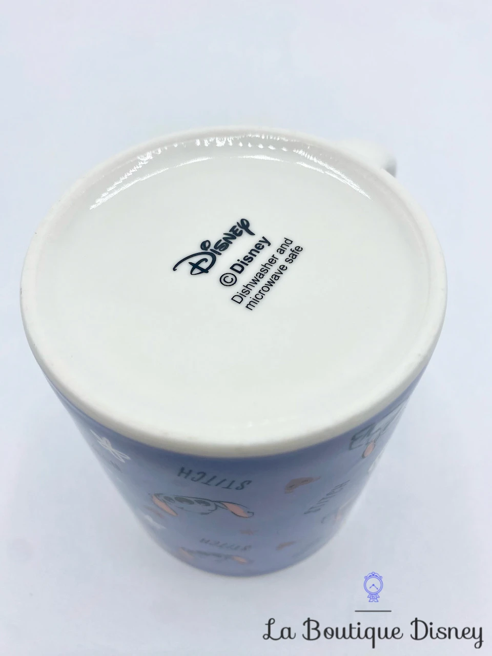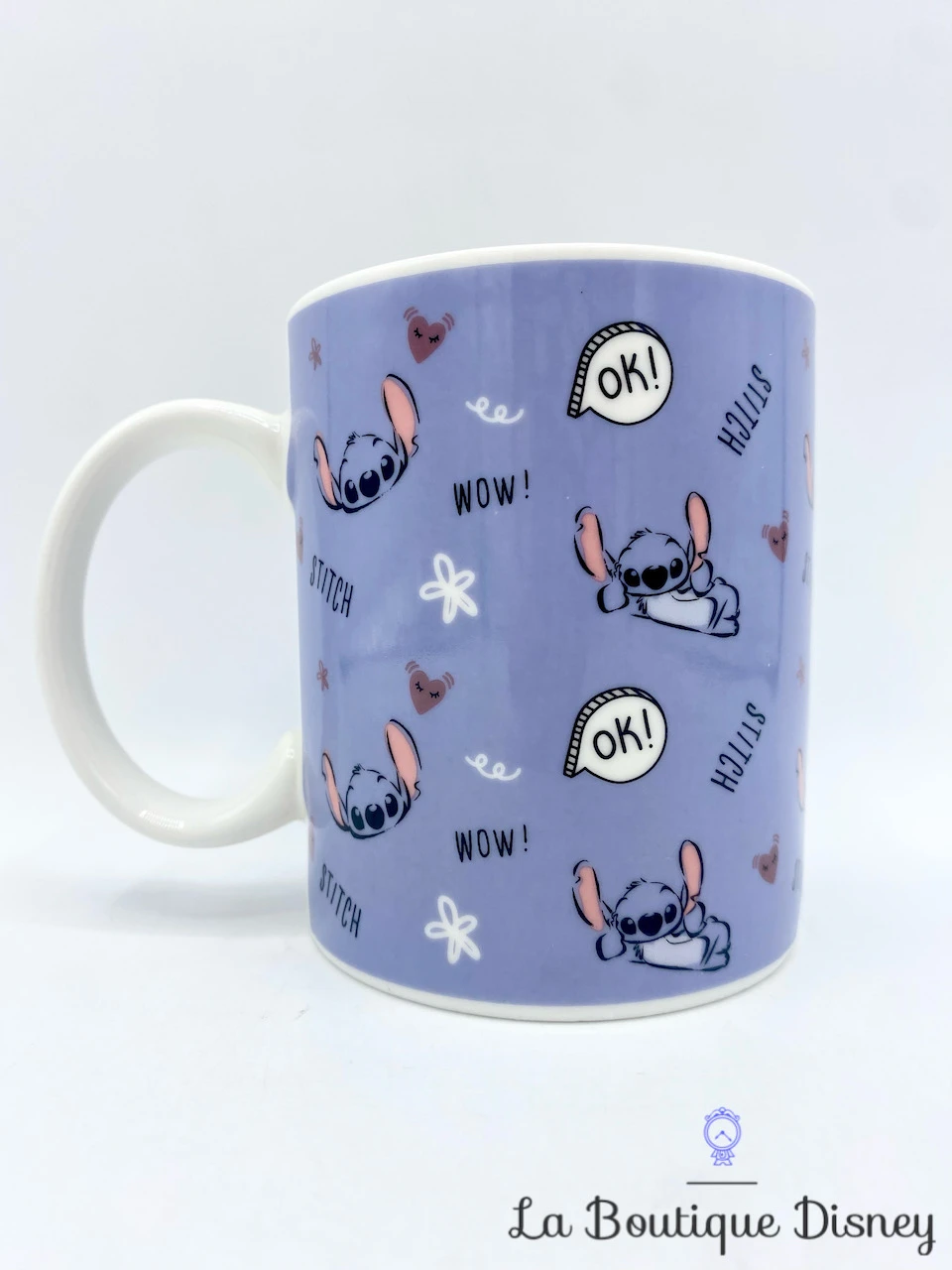 Mug en céramique bleu violet représentant de nombreuses fois Stitch, le petit monstre extraterrestre. Autour de lui, il y a des motifs de coeurs et de fleurs ainsi que les inscriptions « Wow », « Stitch » et « Ok ». Anse et intérieur blancs.