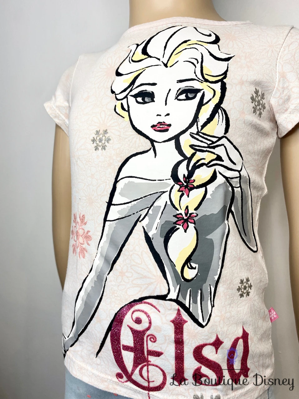 Tee-shirt rose et blanc avec motif imprimé à l’avant de la princesse et reine d’Arendelle, Elsa. Son portrait est imprimé dans de très belles couleurs grises et blanches avec des contours noirs épais. Elle a sa longue tresse blonde. Inscription « Elsa » en dessous en rose à paillettes. Manches courtes. Des flocons de neige viennent parsemer le rester du tee-shirt.