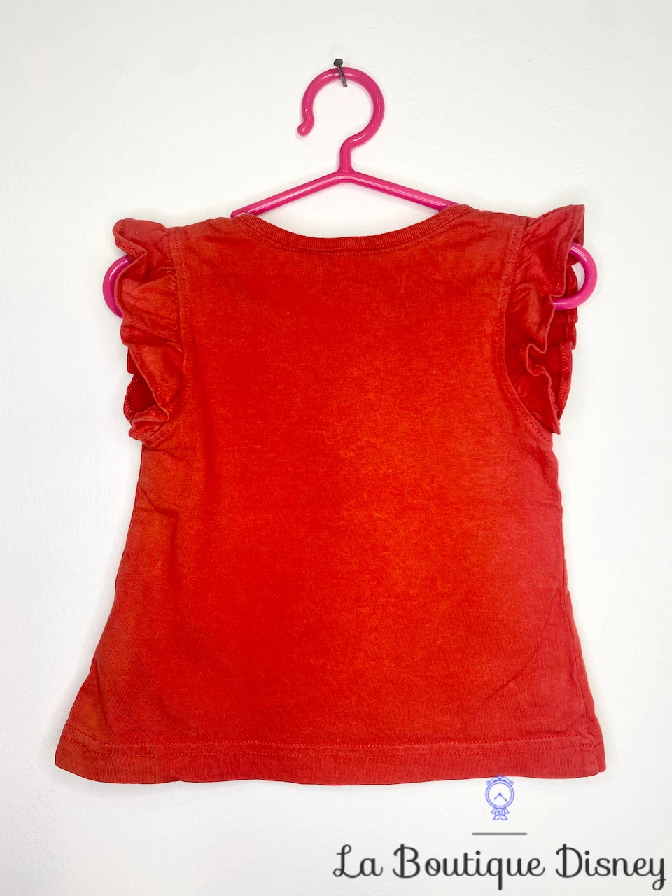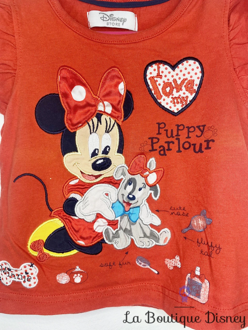 Tee-shirt 100% coton rouge à manches courtes. Manches avec des petits froufrous. Sur le devant, motif imprimé et brodé de Minnie Mouse avec sa robe rouge en train de prendre soin de son petit chiot. Il a y n coeur « I Love my » avec en dessous l’inscription « Puppy Parlour ». Il y a également le prénom « Minnie » écrit dans un petit os. Le petit chien de Minnie a le même noeud qu’elle sur la tête.