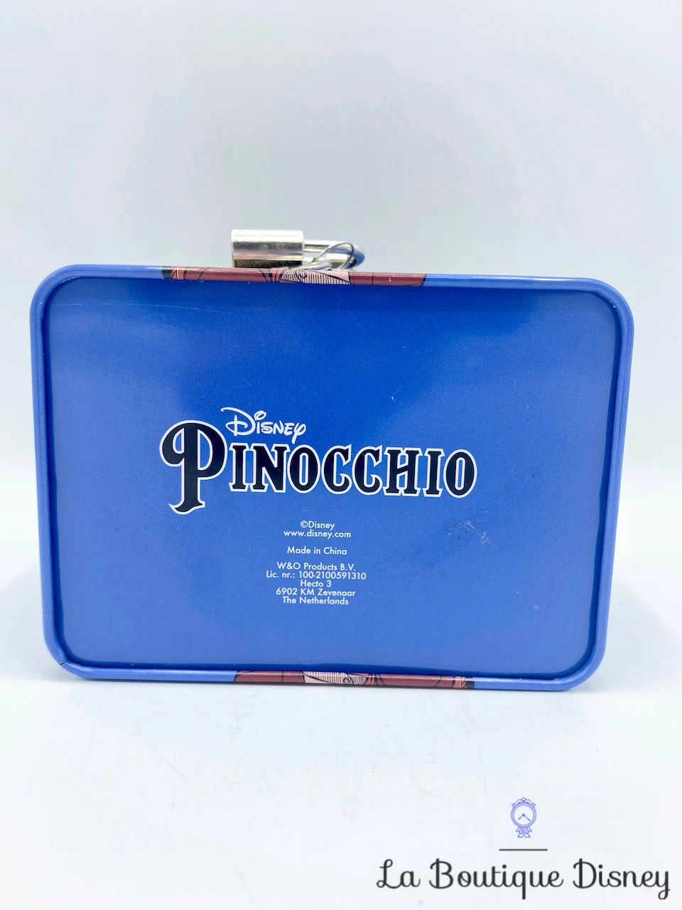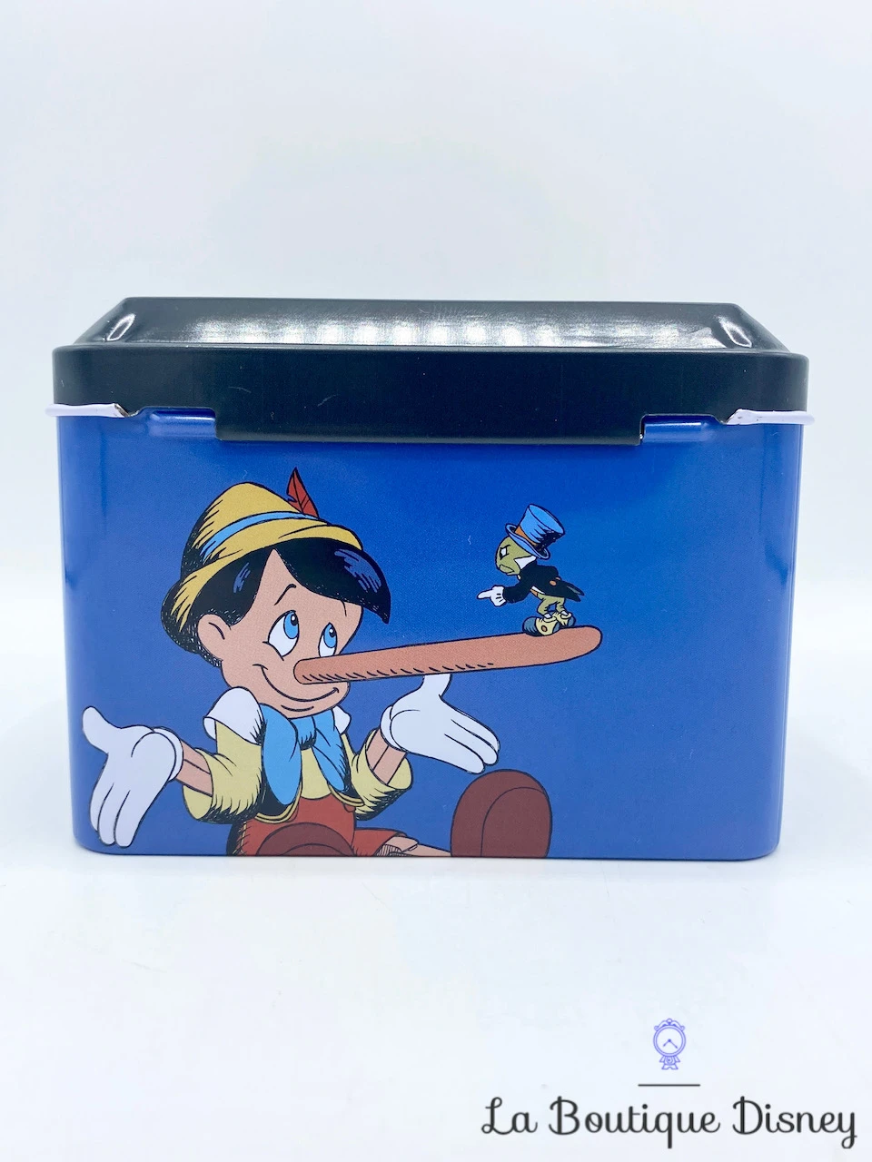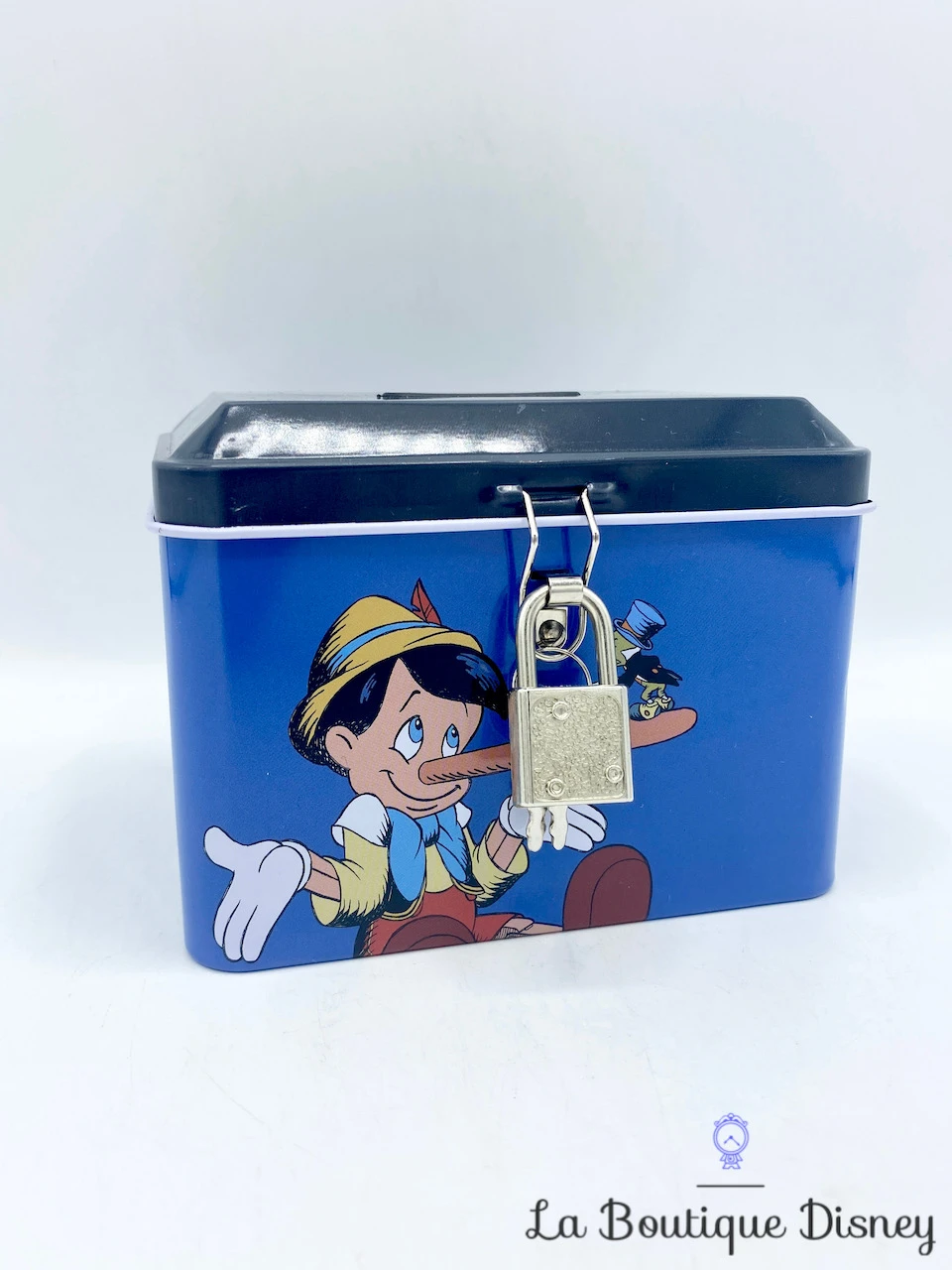 Tirelire en forme de coffret en métal bleu marine avec la plus célèbre des marionnettes Pinocchio représentée sur la face avant et arrière. Pinocchio revêt sa tenue rouge jaune et bleu et porte son chapeau jaune surmonté d’une plume rouge. Il a menti et son nez s’allonge… s’allonge… Son nez est tellement long que Jiminy Cricket, conscience de Pinocchio tient debout dessus ! Sur les deux côtés de la boite, il y a l’inscription « Disney Pinocchio », on la retrouve aussi en dessous. Fente sur le dessus du coffret pour insérer la monnaie. S’ouvre sur le devant grâce à un crochet fermé par un petit cadenas muni de deux clés.