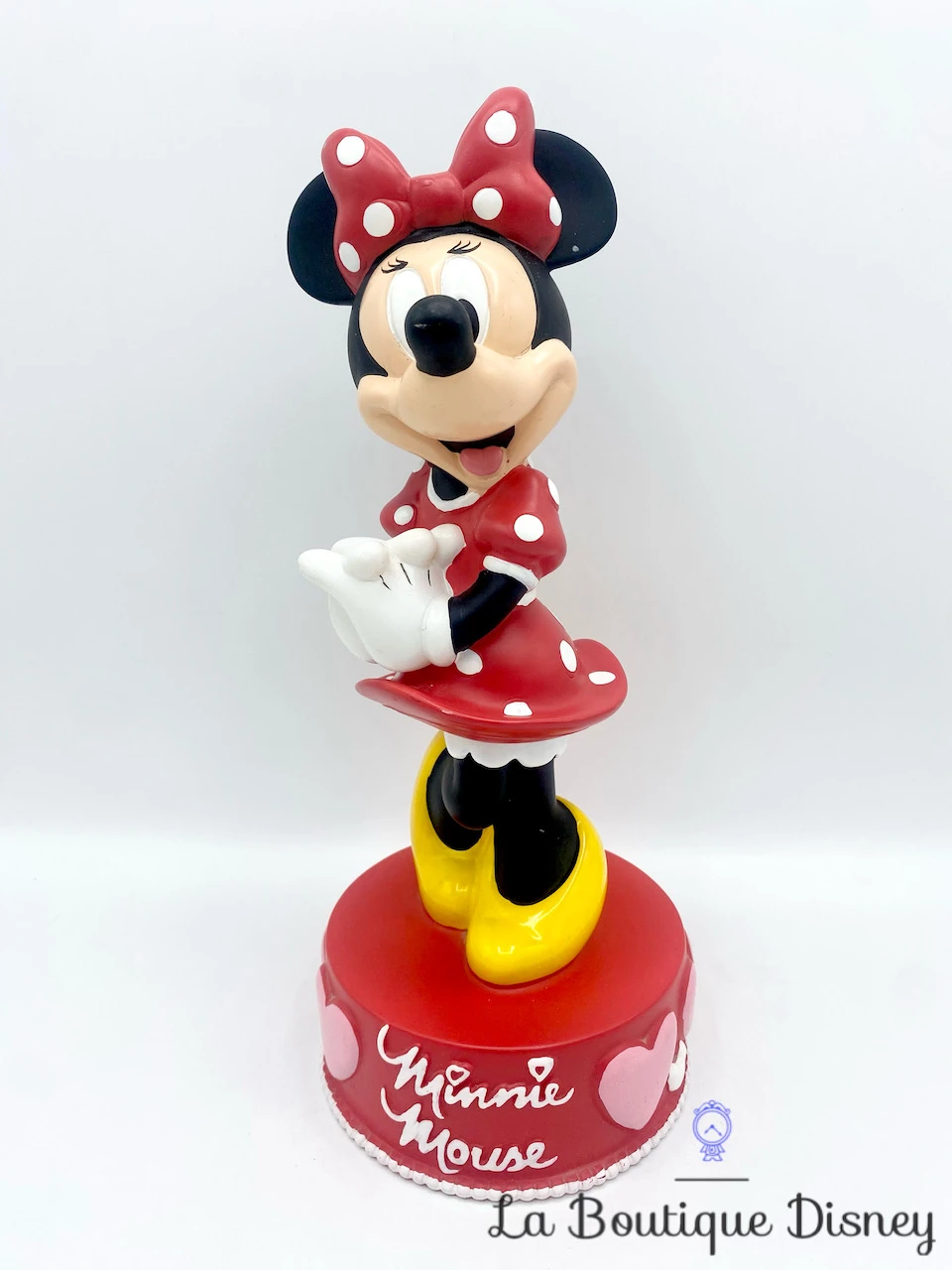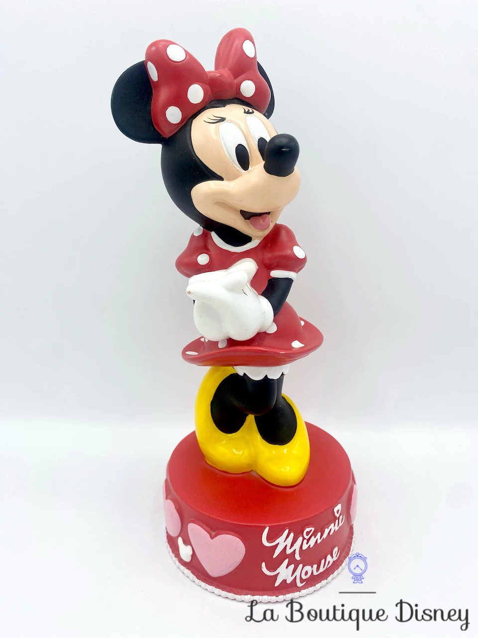 Tirelire en plastique dur représentant la célèbre souris Minnie Mouse. Minnie est debout sur un socle rouge recouvert de petits coeurs roses avec l’inscription « Minnie Mouse » en blanc. Elle porte sa robe habituelle rouge à pois blancs et son noeud sur la tête. Une fente est située sur l’arrière de la tirelire et on note un bouchon récupérateur en dessous.