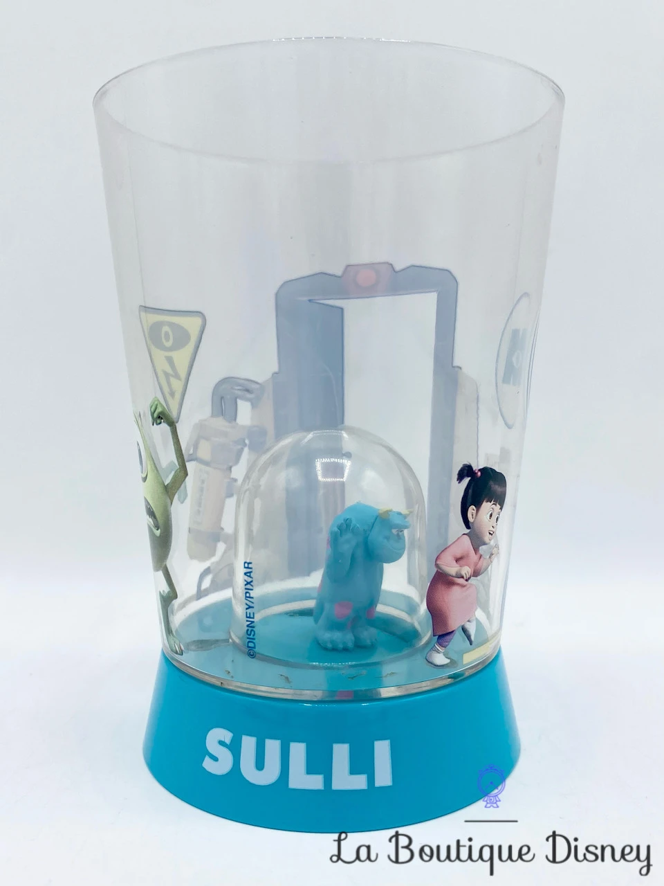 Des verres Disney Pixar magnifiques ! Vous allez adorer vous en servir pour vos boissons et en plus ils cachent une jolie surprise. Dévissez le socle du verre et la figurine est à vous ! Gobelet en plastique transparent représentant le monstre vert Bob Razowski, la petite fille Boo et une porte du dessin animé Monstres et Cie. Socle bleu avec figurine de Sulli à l’intérieur.