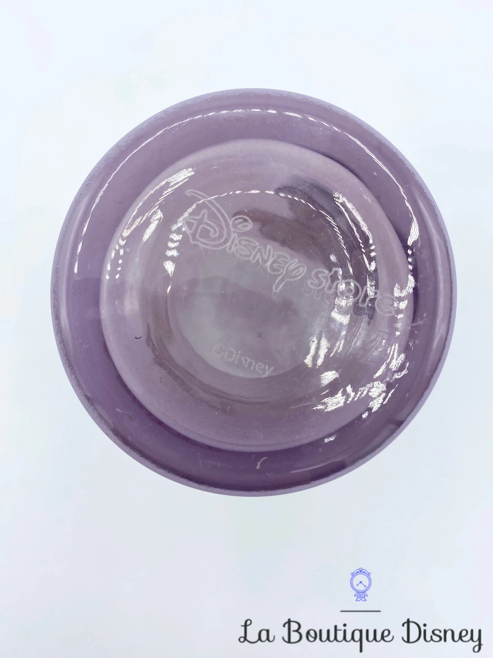 Verre violet avec la représentation sur l’une des faces du célèbre éléphant de la Forêt des Rêves Bleus, Lumpy. Il est assis sur ces pattes arrières et sourit. Sur l’autre face du verre se trouve une autre représentation de lui mais cette fois-ci de profil et sur un nuage. En dessous du célèbre éléphant figure l’inscription « Lumpy » en blanc. Matière : verre.