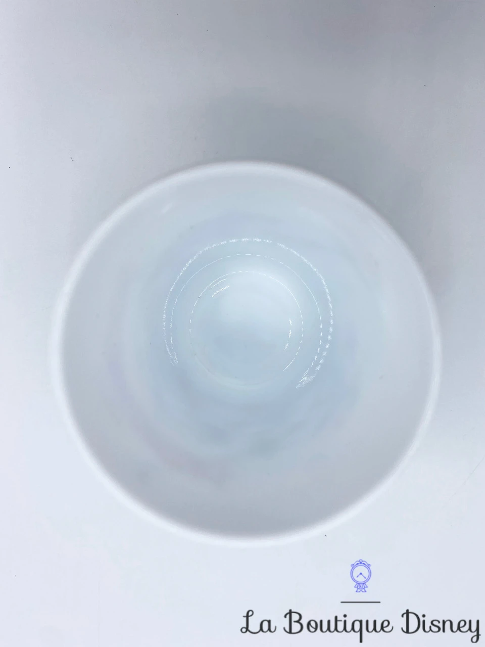Petit verre style gobelet en céramique blanc avec dessin de Meeko, le raton laveur ami de Pocahontas tenant dans sa main son célèbre biscuit. Il est accompagné de Percy, le petit chien blanc, qui essaie de lui piquer sa nourriture. Ils sont entourés de feuilles vertes, rouges et bleues. Inscription « Disney Pocahontas » en rouge avec la typographie du film.