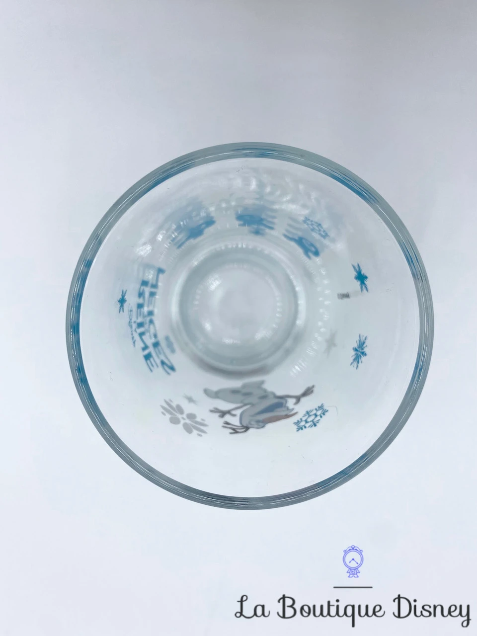 Verre Ă moutarde reprĂ©sentant Olaf, le bonhomme de neige du dessin animĂ© La reine des neiges. Il est en train de levĂ© les bras en l’air et il semble content. Il est entouré de flocons de neige bleus et blancs. De l’autre cĂ´tĂ© du verre, il y a trois petits Snowgie bleus. Inscription « La reine des neiges » avec la typographie habituelle du film. Matière : verre.