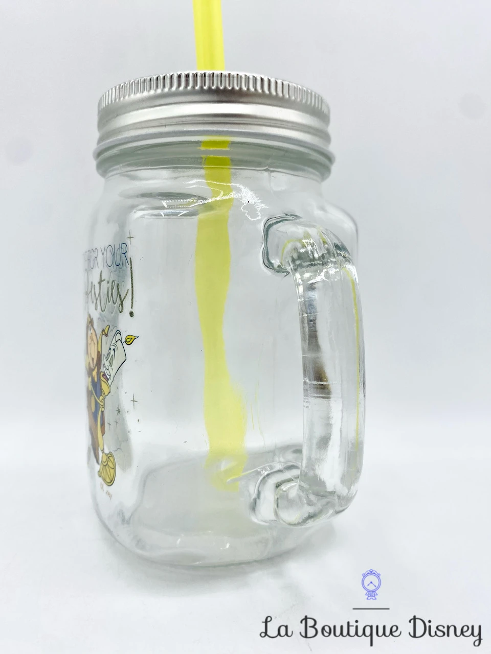 Verre / Tasse / Mug en verre épais transparent avec sur le dessus un couvercle dévissable couleur argenté. Sur le devant, il y a un motif de Lumière le chandelier, Big Ben l’horloge, Madame Samovar la théière et Zip la tasse. Au dessus d’eux, se trouve l’inscription « Make time foy your Besties ! « . À l’intérieur se trouve une paille jaune pour pouvoir emporter votre boisson partout avec vous en toute sécurité !